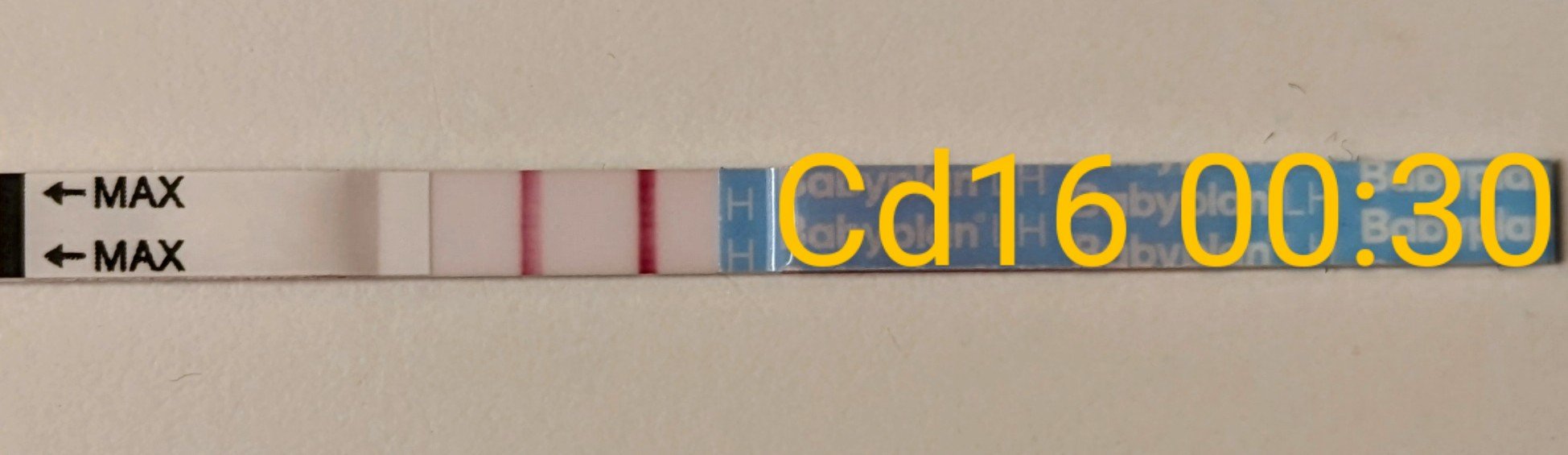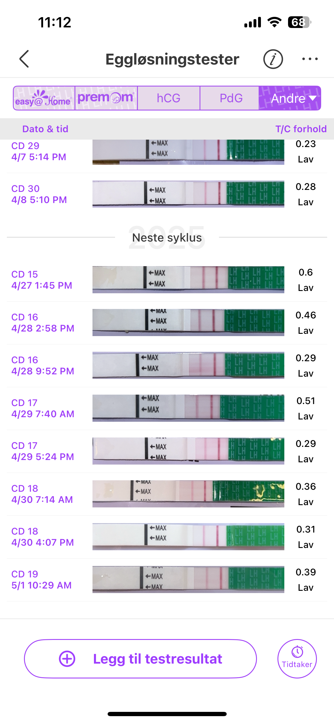 Her er hele testrekken min denne syklusen, tørket. Klarer ikke helt bestemme meg for når positiv var, men det var uansett innenfor ila 12 timer eller noe, så da vet jeg sånn ca. Jeg temper også, kanskje den øker i morgen :happy: