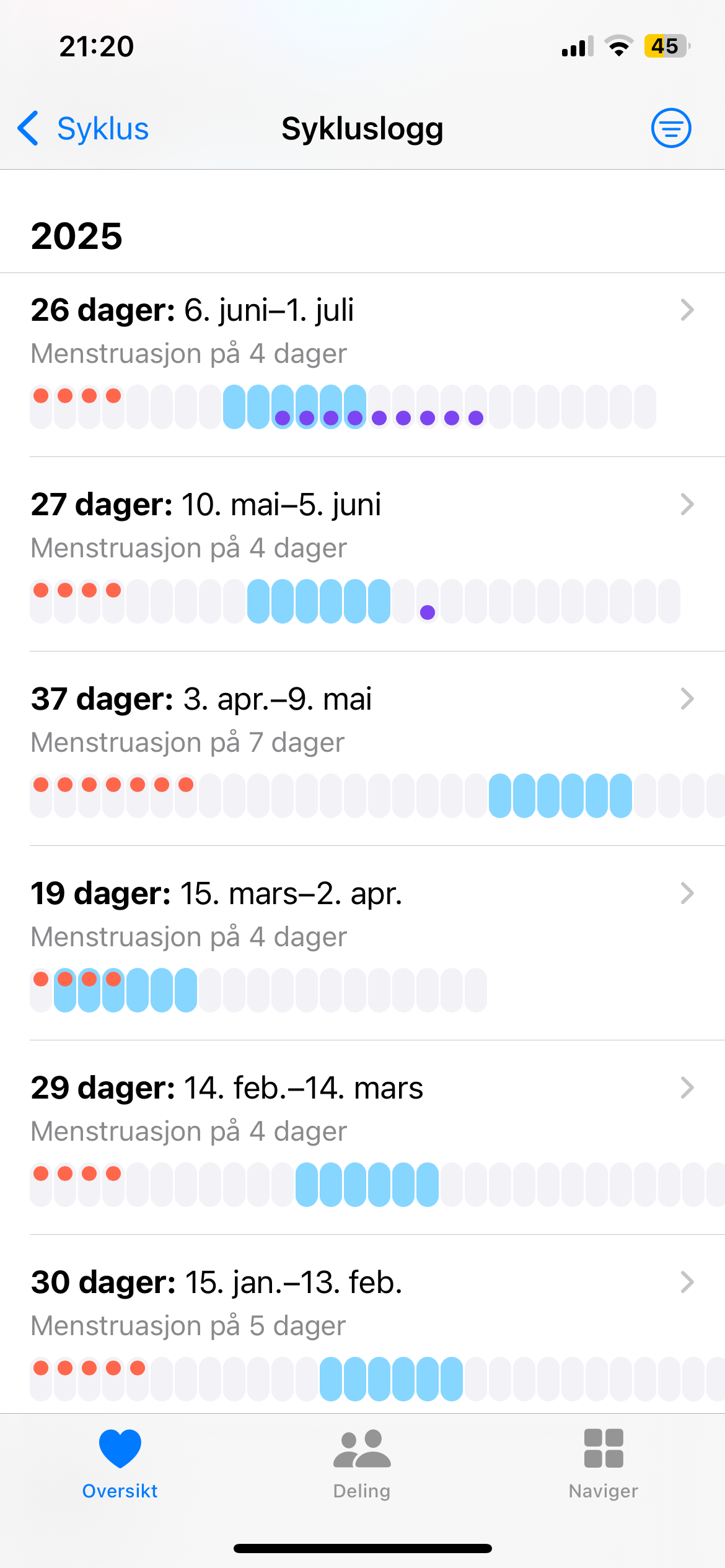 Her er syklusene mine i år frem til pilleslutt. Lilla prikker er samleie eller mellomblødning. Røde prikker er «mensen». Alt dette på pillen som heter Slinda.