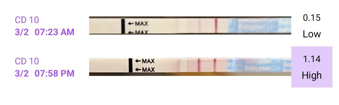 Mine sykluser/LH topper går altså så fort. Kan liksom ikke slække litt for plutselig er toppen over på et blunk. Hadde meget negativ test på morran i dag, og skulle bare ta en test før jeg la meg etter en meget slitsom dag og POFF! Der kom toppen gitt, holdt på å gå glipp av EL sist fordi den kom og gikk før jeg fikk innsett det engang og det var bare to uker etter EXU. Så antok at jeg hadde LH toppen den natta siden jeg aldri fikk"høy" test resultat. Og ble jo gravid, men endte i SA. Hadde bare flaks ved at vi la aksjer dagen før EL den syklusen. Trodde jeg skulle få EL om noen dager nå også plutselig var den her, akkurat samme som skjedde sist også. Spørs om kroppen har like dårlig tid som meg om dagen :laughing002
