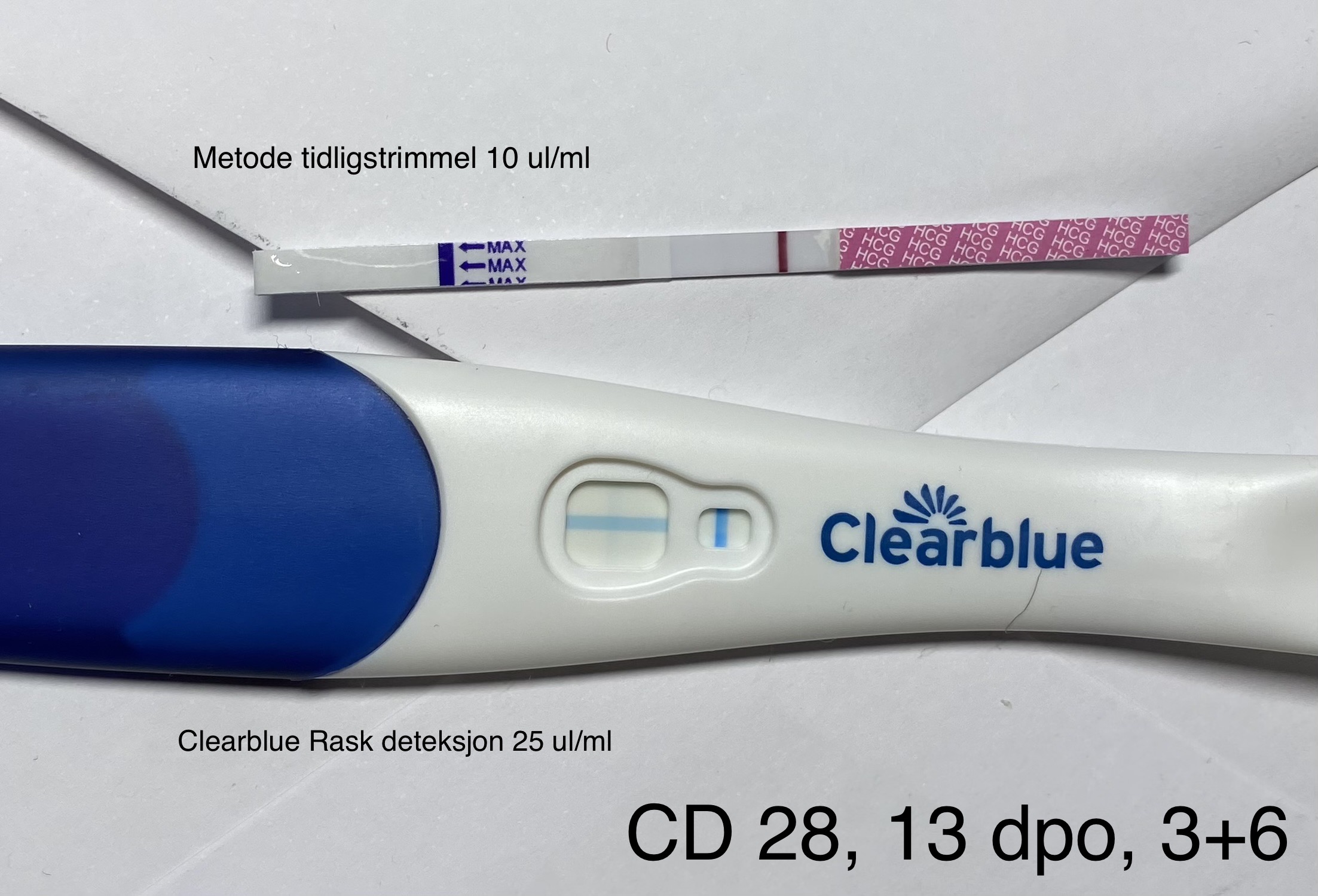 Metode-testene er noe ræl altså. Disse to testene er tatt på samme urin (prøve i glass), og den øverste viste ikke antydning til strek før lenge etter avlesningstida. Det er i tillegg en tidligstrimmel som skal ha sensitivitet på hcg 10 ul/ml. Mens ordinær Clearblue med 25 i sensitivitet ga tydelig strek det øyeblikket den begynte å ta farge.