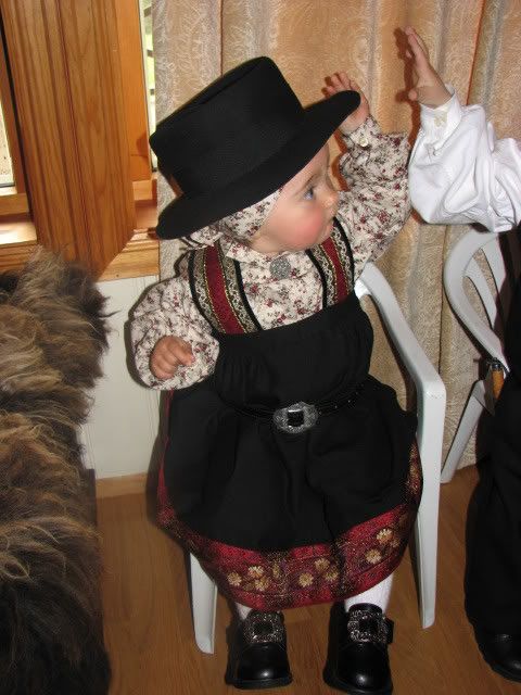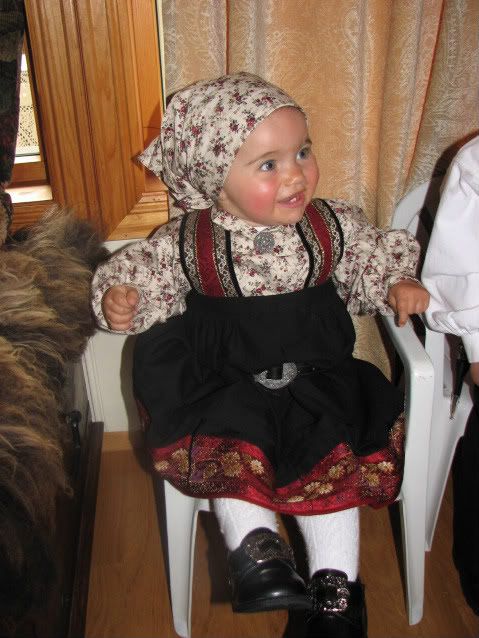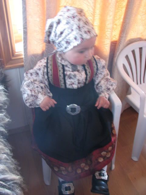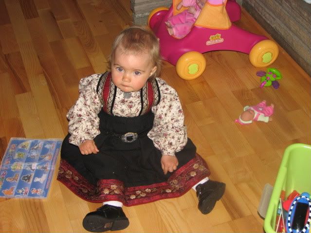 Her kommer våre bilder!![:D] Ine Marie feirer sin første 17 mai i en alder av 5 måneder! Der hun har på seg en bunad som er 32 år gammel (som søstra mi fikk da hun ble født), og en sølje som er 26 år (som jeg fikk da jeg ble født)!![:)]
