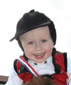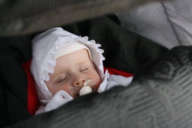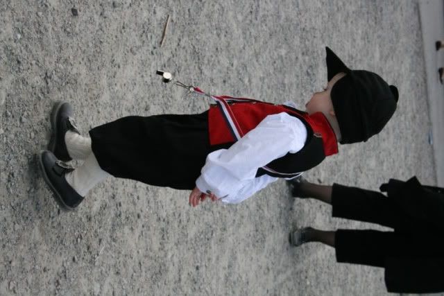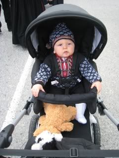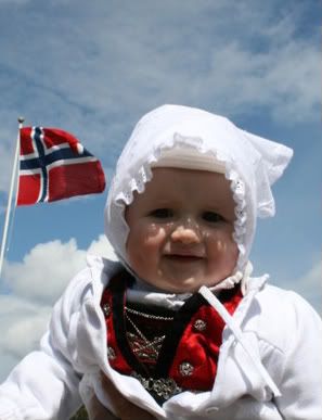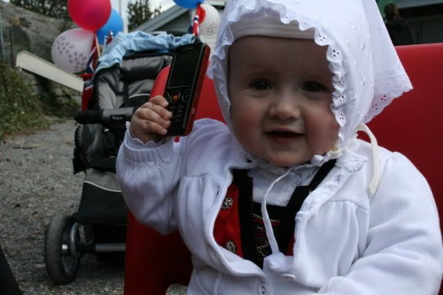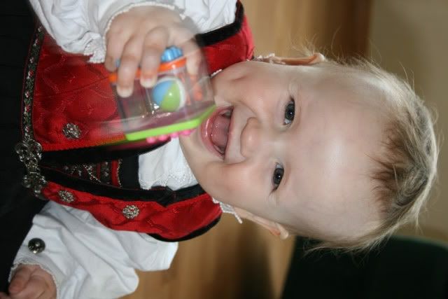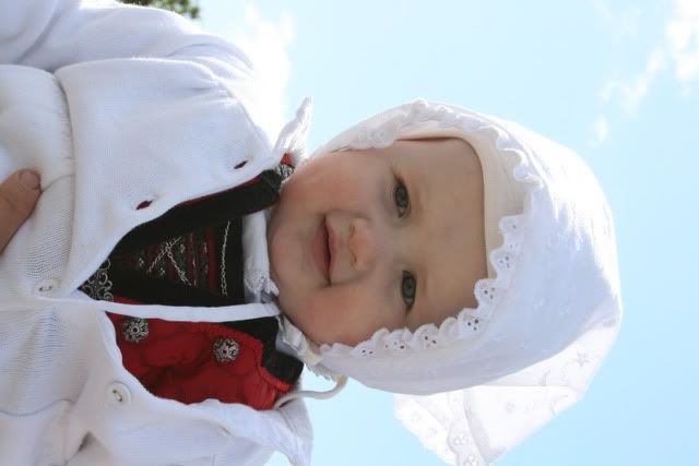 Her er vår datter Veronica, hun feirer nasjonaldagen for første gang. Mormor har strikket bunaden til henne. I går var det også et halvt år siden Veronica ble født!