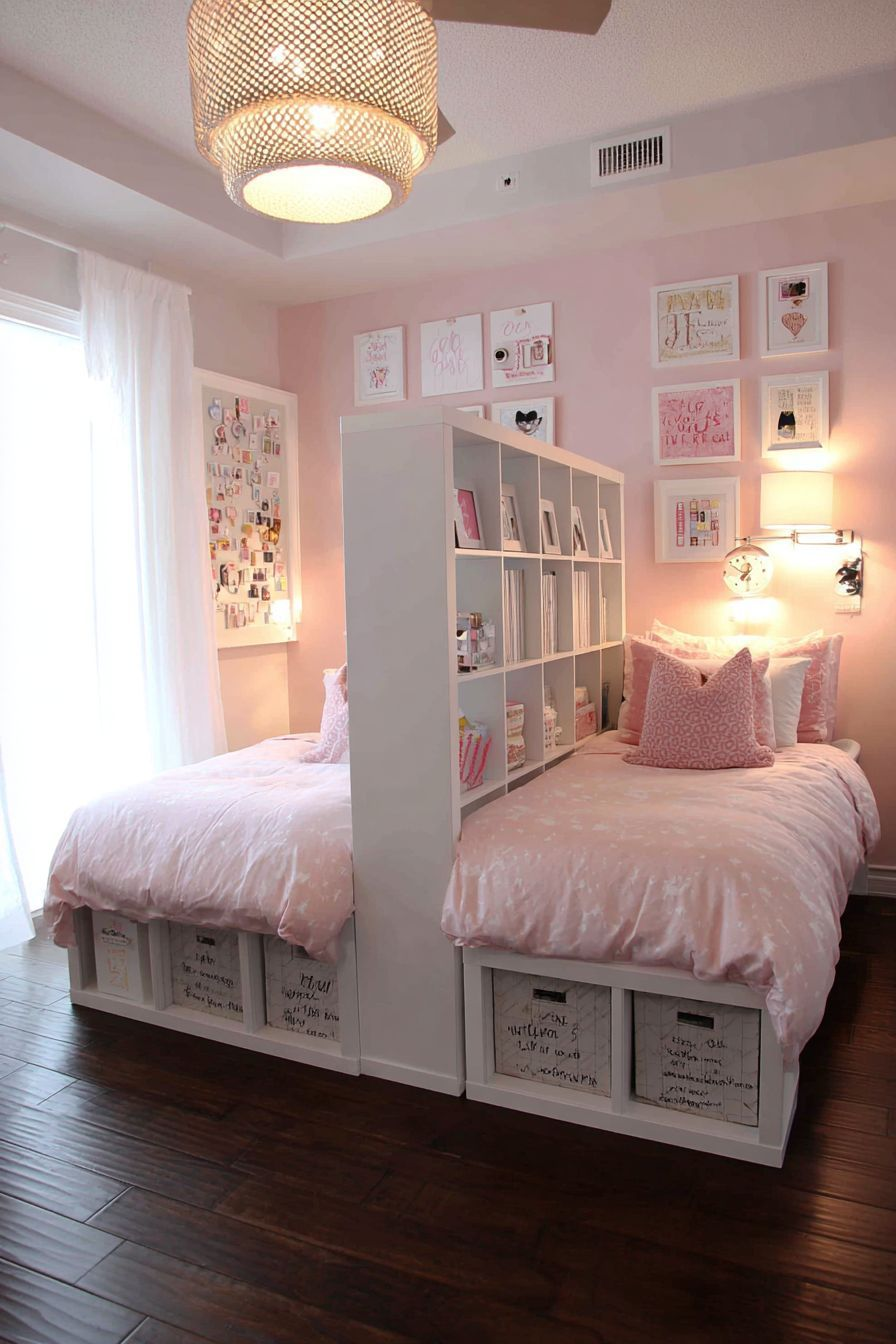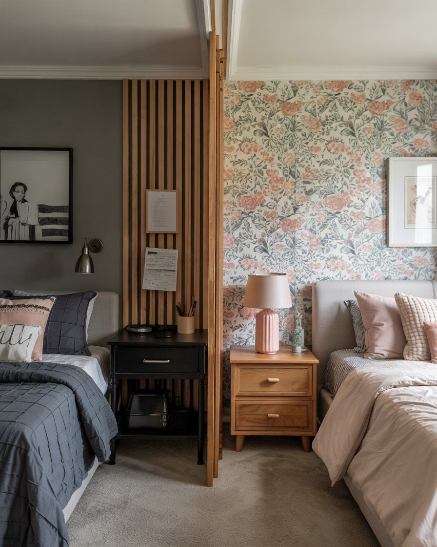 Metodene for å avgrense visse deler av rommet kan være mange. Skyvedører, gardiner, bokhyller, halvvegger, helvegger ++. Alle bildene jeg har funnet er på pinterest. Kan være en ide å titte innom der, og lagre det du tenker kan funke for dere nå og i fremtiden. Da får du goood tid til å tenke på mange løsninger, samtidig som at du leser barna mens de vokser opp og ser hva de trenger av space.