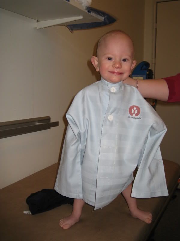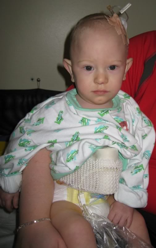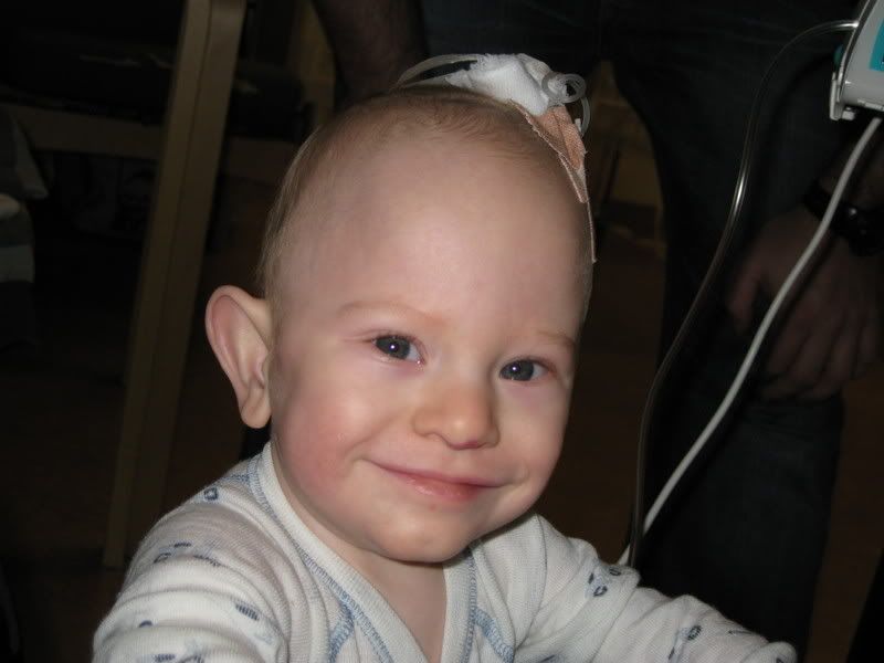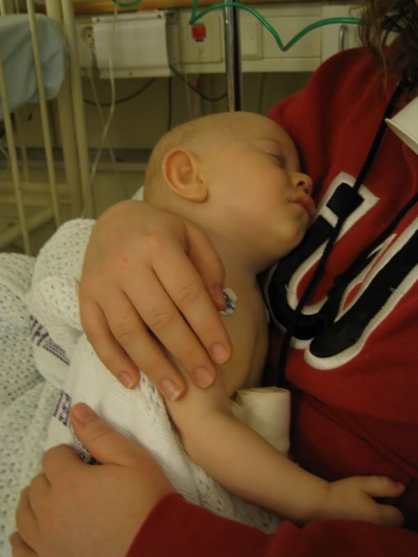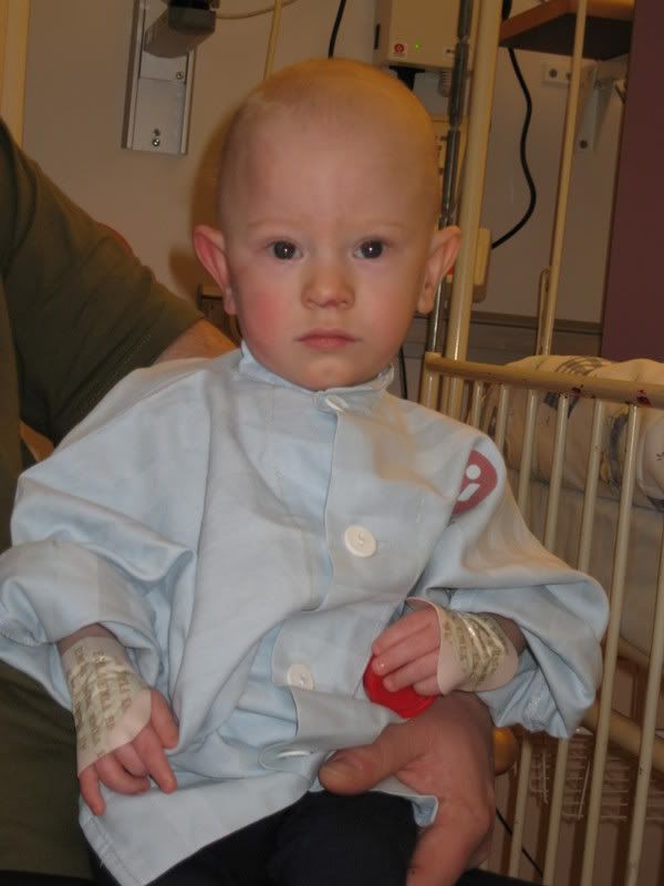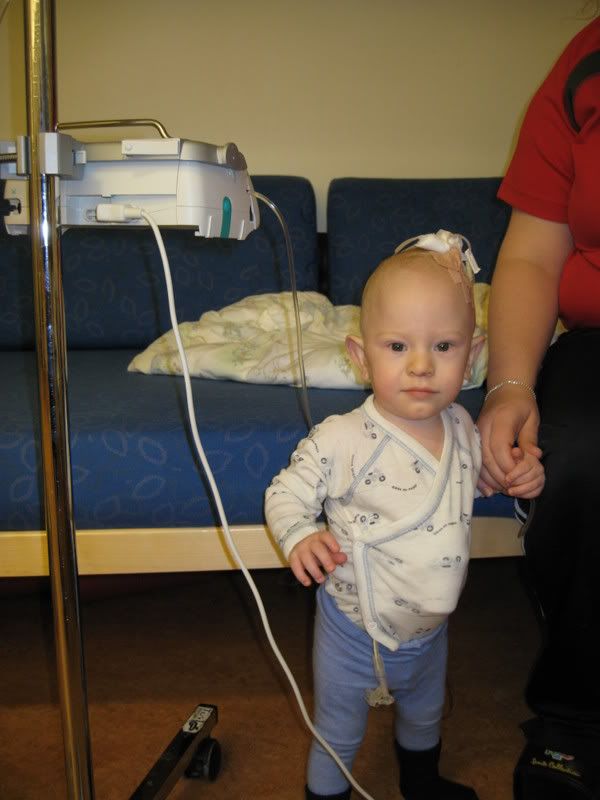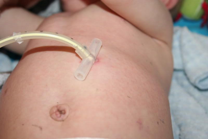 Her er PEG'en. Navlen ser litt rar ut da han fikk utført kikkehullsoperasjon for å fjerne lyskebrokk på samme tid som han fikk Peg.