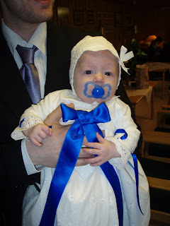 Vi lånte en hvit heklet dåpskjole, med heklet lue til. Jeg valgte å ha lys lilla bånd på[:)]