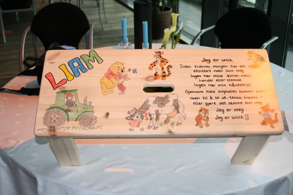 Syns denne krakken var flott! [:)] Venninna mi som er fadder som har tegna på den (faren har snekkra) Kan jo male eller skrive på en ferdigkrakk/stol/bord feks? [/image]