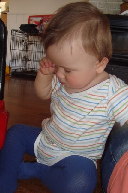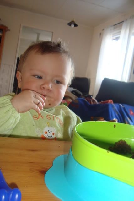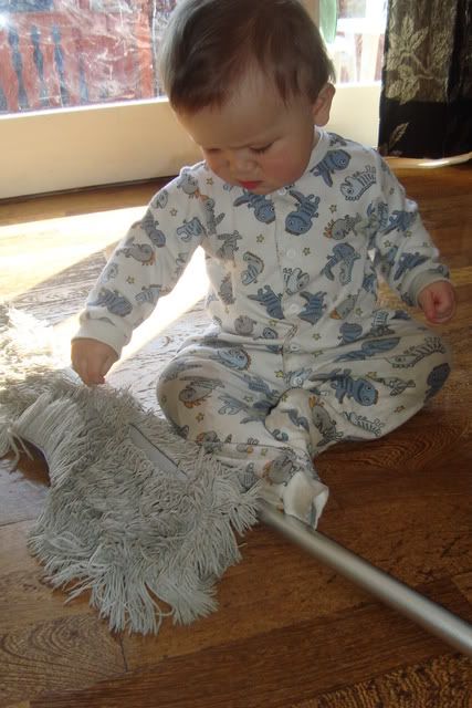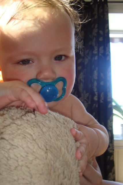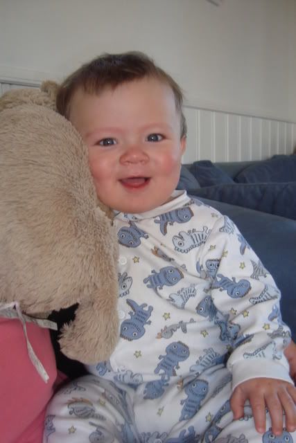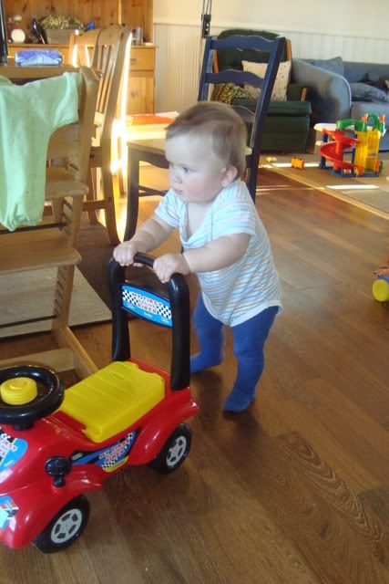 Nå er han derimot et stoooor klump blitt. Han fikk gåbil av bestemamman sin og den har han virkelig fått fart på. Løper nesten rundt her med den. Han fikk også en bilgarasje fra fisher-price som falt i goood smak. Ellers fikk han matboks og drikkeflaske, joggedress, "biler" -lastebiltelt, sangkort, bok med lyd i og div andre ting.. Skal feire mer i morgen med resten av familien, så da blir det vel enda mer, hehe[:D]