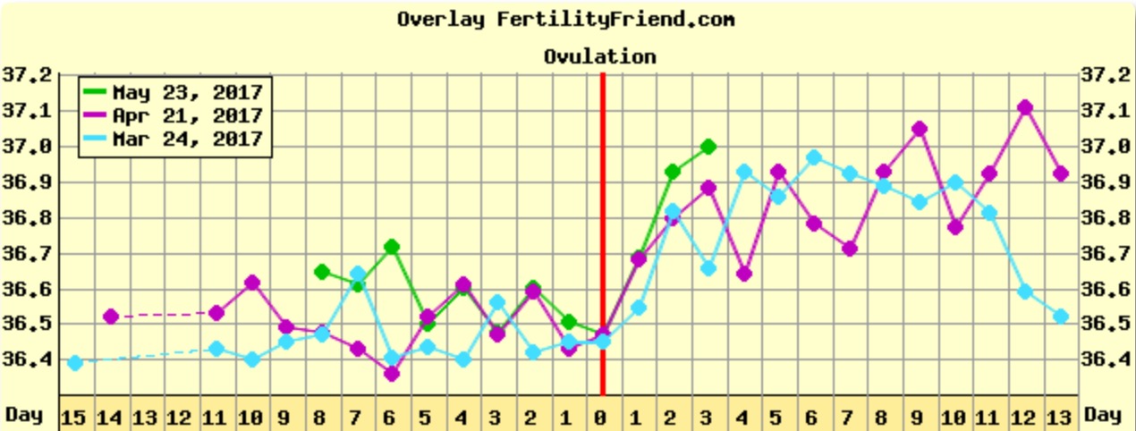 I dag kom krysset. Tempen gikk enda litt oppover.Første test ryker neste fredag, er da 10dpo.