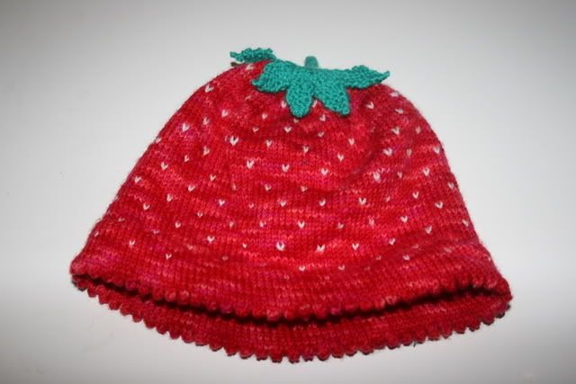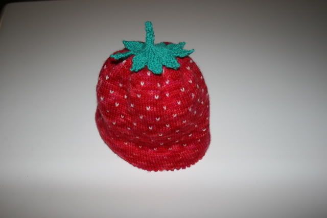 Veldig enkel egentlig.. strikker først åtte omganger, så en hull rekke, så åtte omganger til, så begynner en med de hvite prikkene, etter ca 13cm (spørs hvilken str) så begynner en å strikke 9 masker så 2 rett sammen rundt hele pinnen, så en omgang uten felling, så 8 masker og 2 rett sammen, helt til den omgangen der en strikker 4 masker og 2 masker rett sammen, så skifter en til grønn fargen, så fortsetter fellinga til en har 6 masker igjen, så strikker en de 6 maskene ti omganger (de 6 maskene er stilken) . så felles det av.