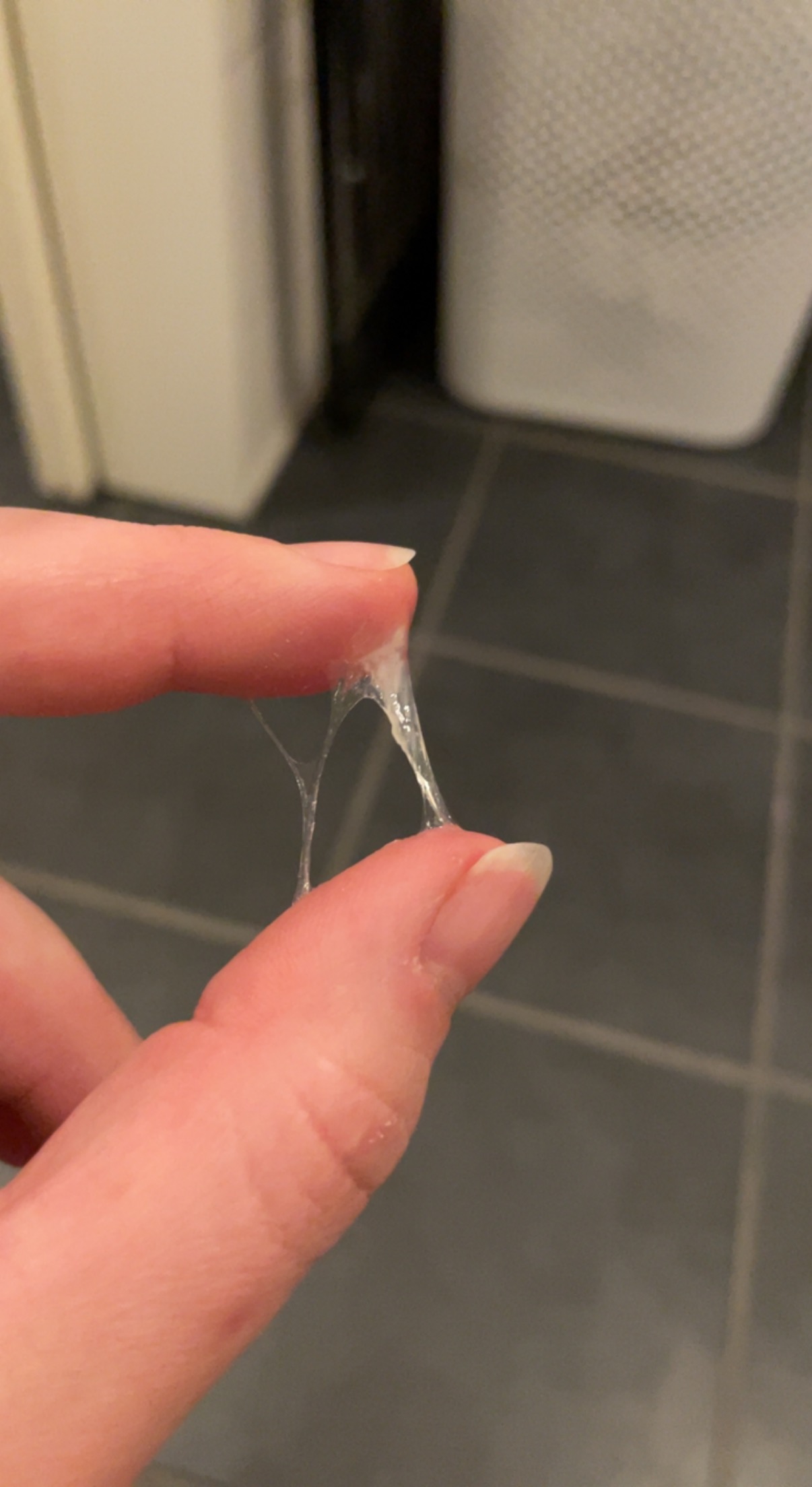 Jeg har aldri studert eggløsningsslimet før, men gjorde det i dag da jeg såg slim på papiret. Er dette eggløsningsslim? Skulle hatt mensen for 8 dager siden, var hos gynekolog i dag som sa "oi, nå var slimhinnen veldig tykk, så nå kommer straks mensen", også sa hun at kroppen hadde prøvd på eggløsning på venstre side, men ikke fått det til. Når jeg var hos samme gynekolog for 2,5 uke siden så sa hun "her ser jeg at du nettopp har hatt eggløsning på høyre side"? men mensen kom aldri og jeg er ikke gravid. Da syns jeg det er rart om jeg får eggløsningsslim nå? Har ingen tegn på at mensen er rett rundt hjørnet, da pleier jeg alltid å spotte i 1-2 dager, få kviser 3-4 dager før og sinnsykt søtsug. Hver eneste gang. Så kan syklusen være så på bærtur at nå, 8 dager etter ikm så kommer eggløsning? Kunne dra slimet lenger ut enn på bilde forresten. Det luktet ingenting og kjentes ut som eggehvite, kanskje ørlite mer klissete.