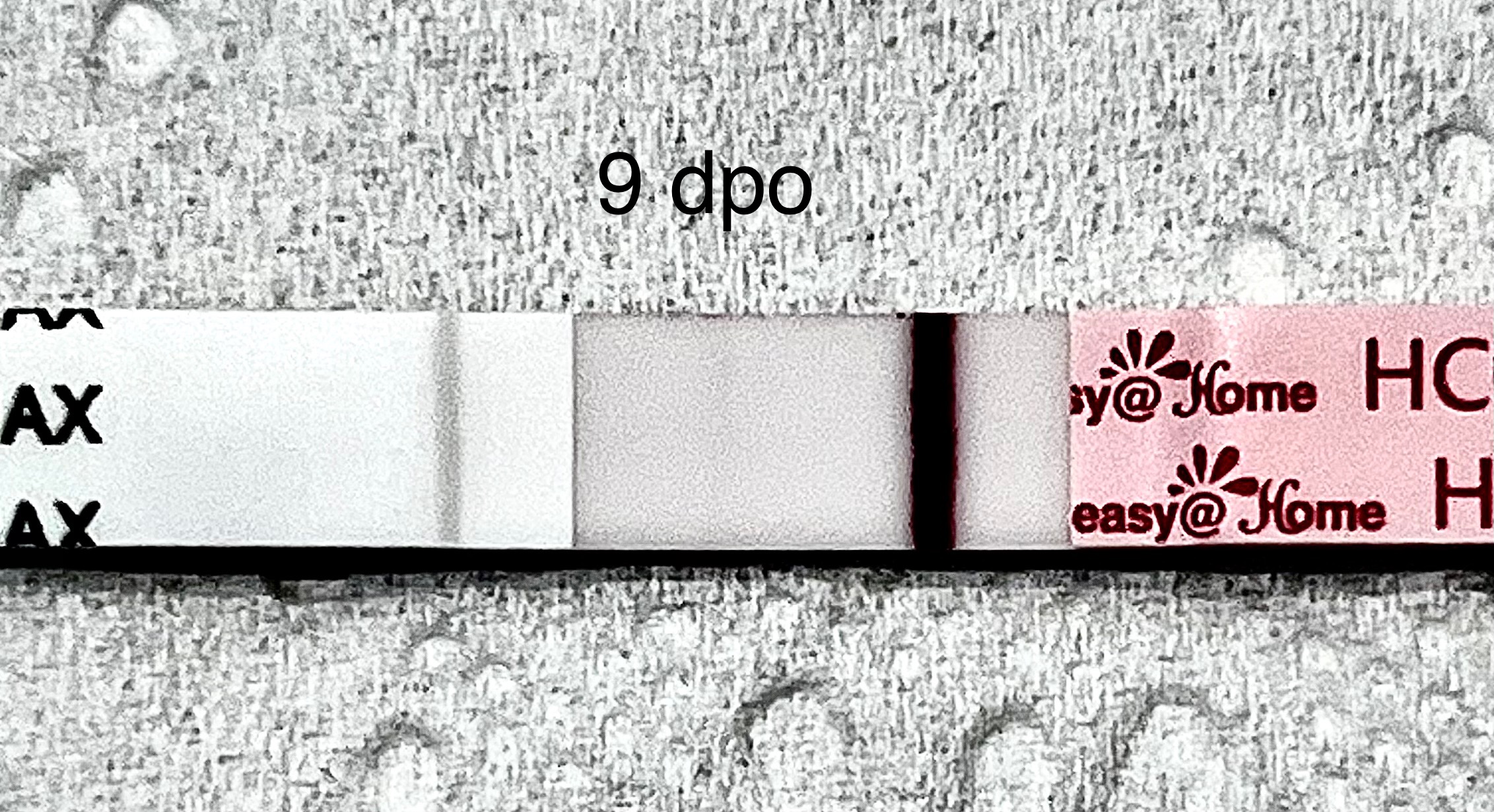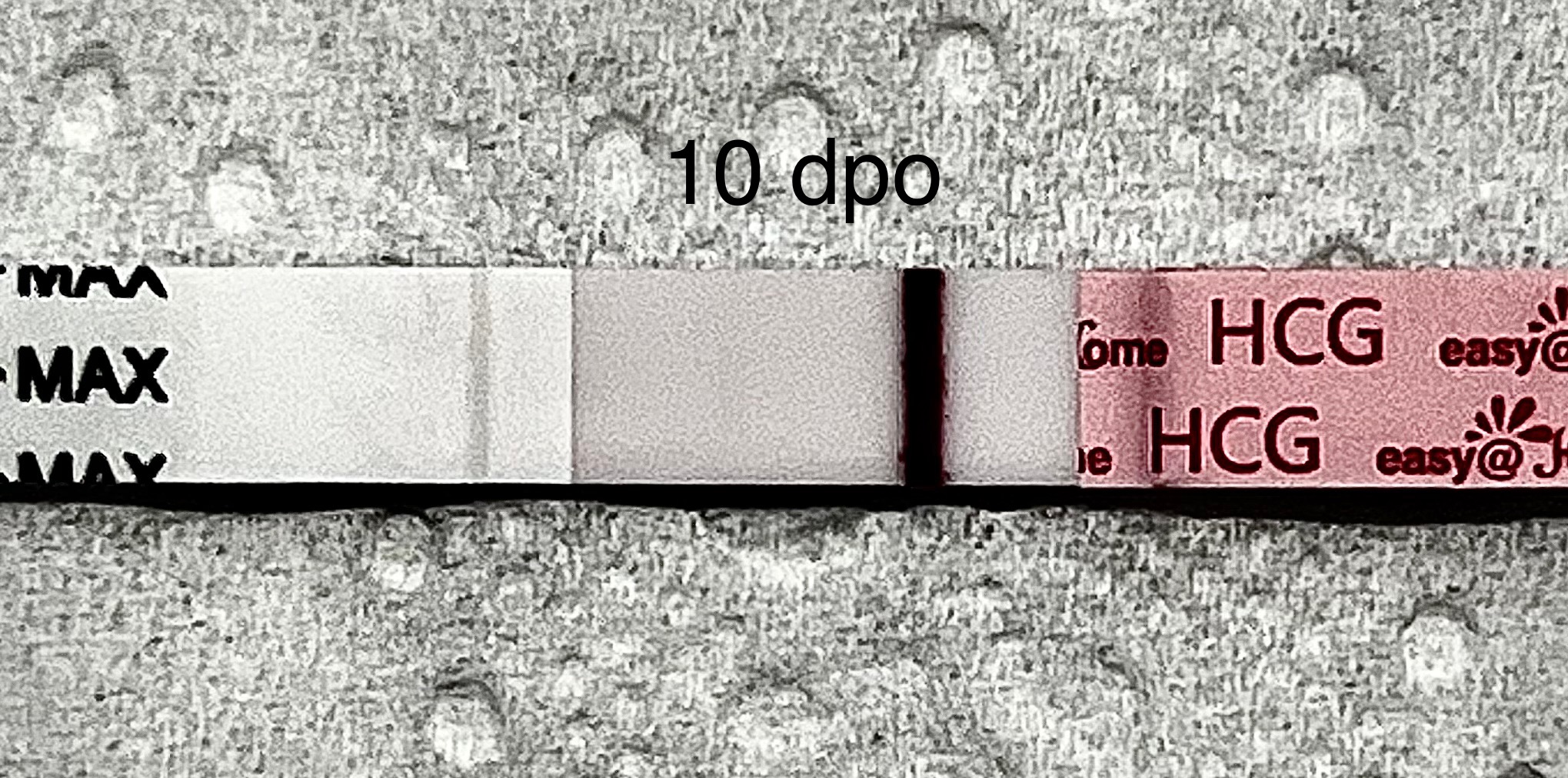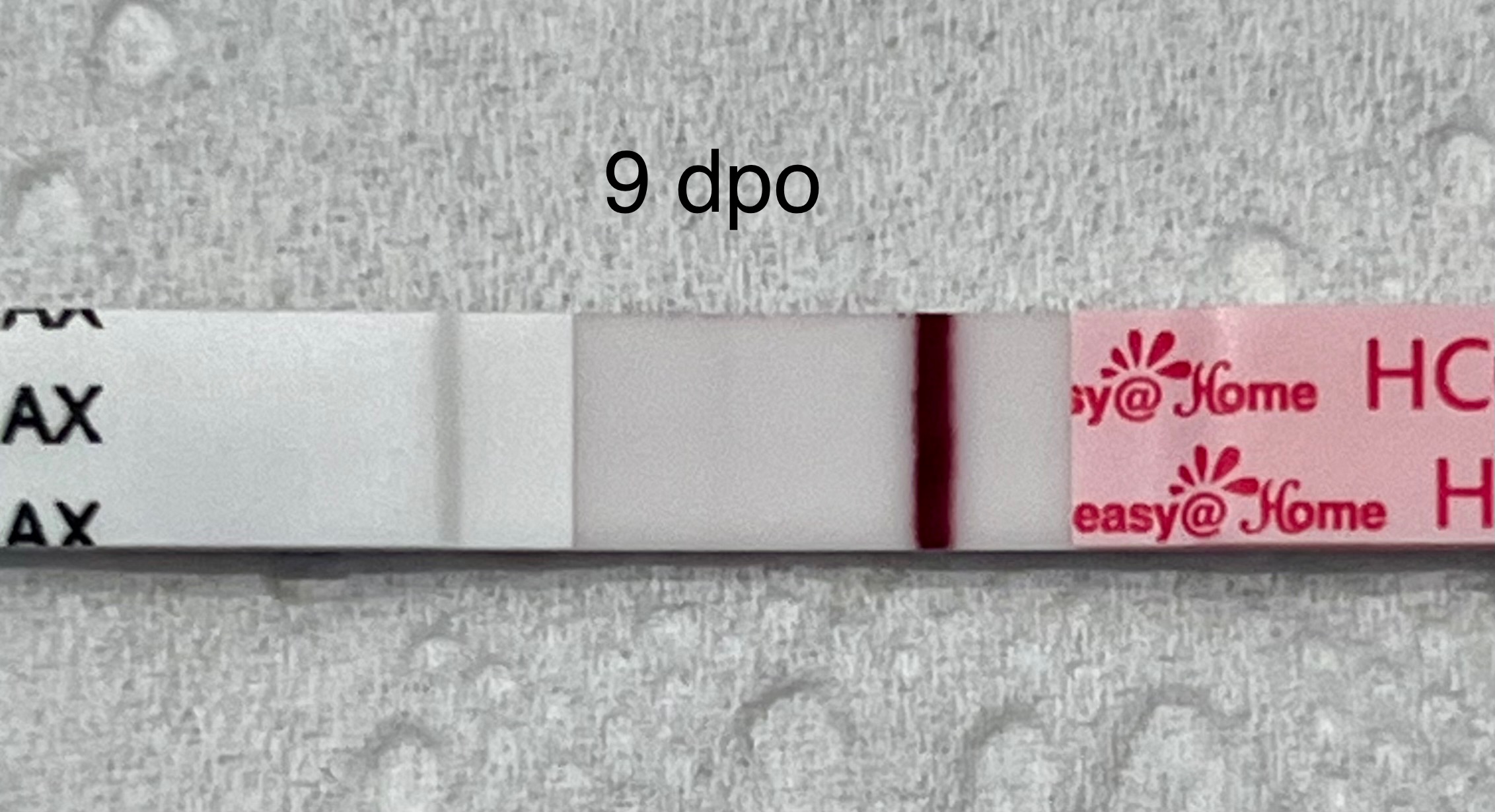 Siden Make sure-testene kanskje ikke er helt til å stole på, fant jeg fram noen easy@home-tester jeg hadde liggende (ikke gått ut på dato). Tok en ny test nå, og det kom strek på den også! De testene har jeg erfaring med at slår ut litt seint, så at den slår ut allerede nå hadde jeg ikke forventet! Måtte sammenligne med en easy@home-test jeg tok ved graviditeten i 2024, på samme dag som jeg også målte hCG hos legen. Så vet at hCG ved den testen var på 78. Jeg synes dagens test ikke er langt unna i styrke! (Men litt forskjell er det jo…)