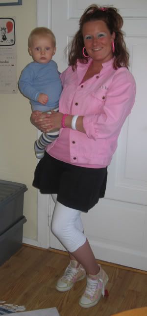 Dårlig bilde, men jeg hadde på meg knall rosa strømpebukse (kjøpt på Kiwi faktisk), svarte pumps, svart kort kjole og den rosa jakka som du ser på bildet.. Fant ikke krepptanga mi i flyttelasset, så ble bare en rosa sløyfe i håret og rosa øreringer. Knallrosa øyenskygge og leppestift. De fleste hadde store hår (gjerne kreppa eller parykk), knalle farger, korte shorts, leggvarmere, badedrakt utenpå tights, grilldresser eller dissa store BALL collegegenserne.