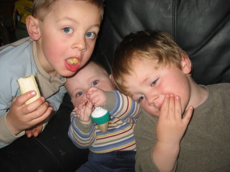 Brødrene spiser banan sammen, gav den til Jamie så ville Aog O og ha, så da måtte jeg ta et bilde: