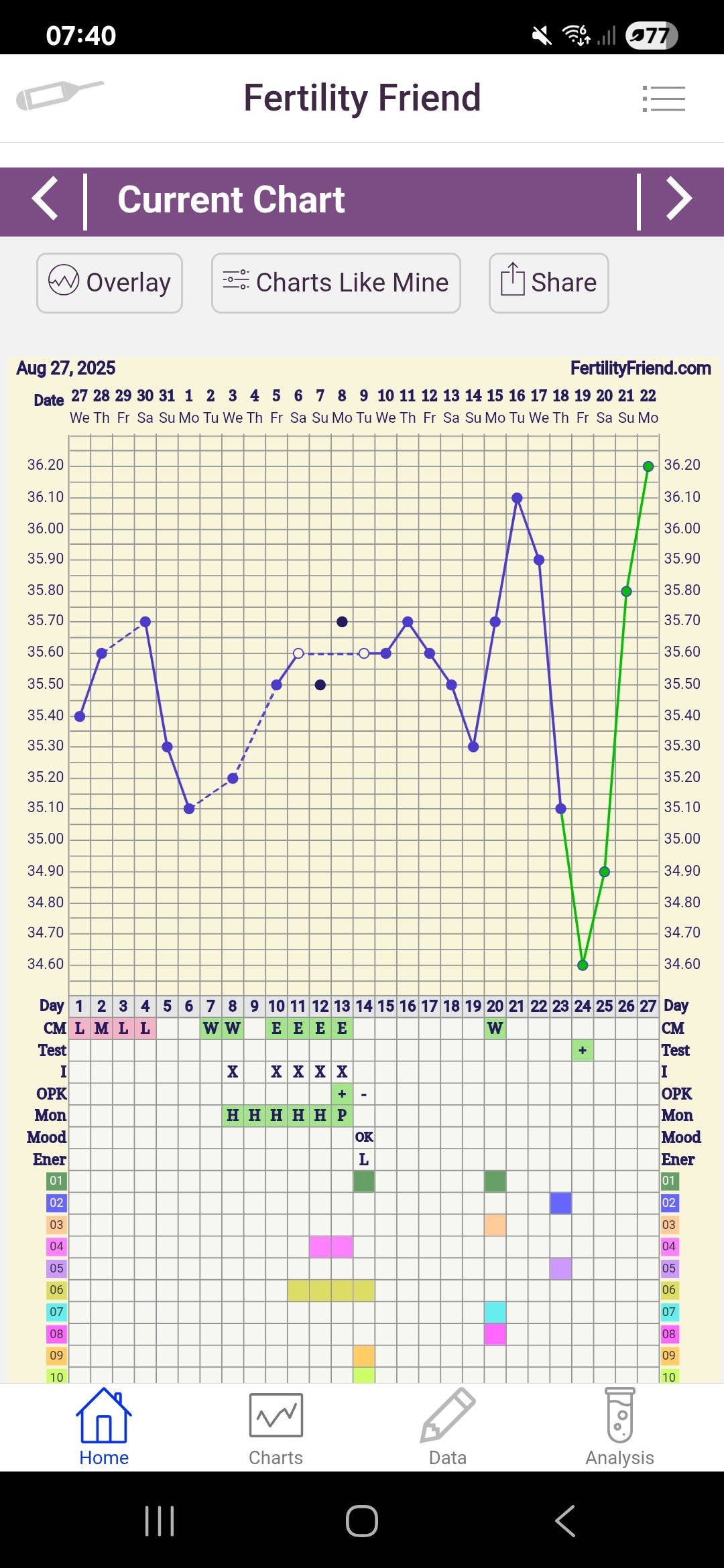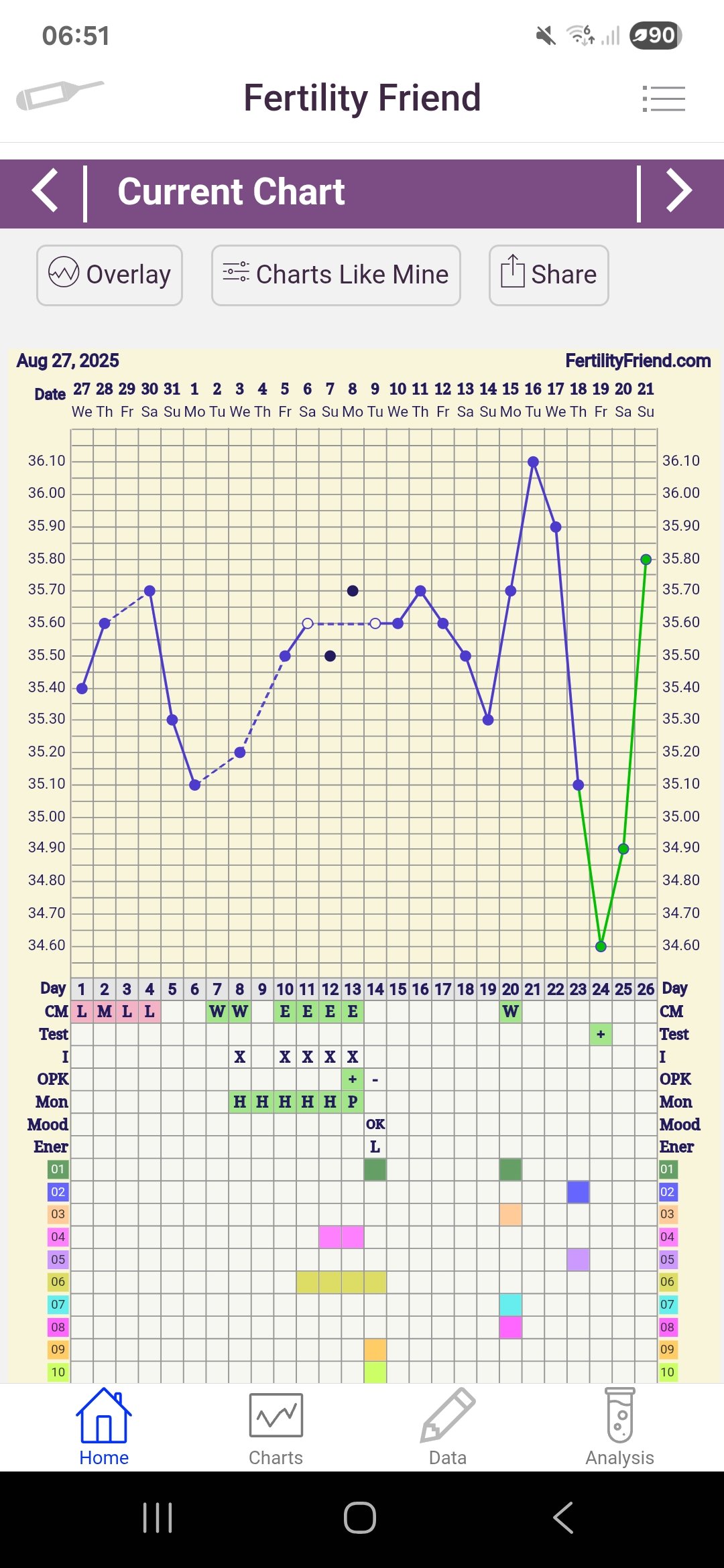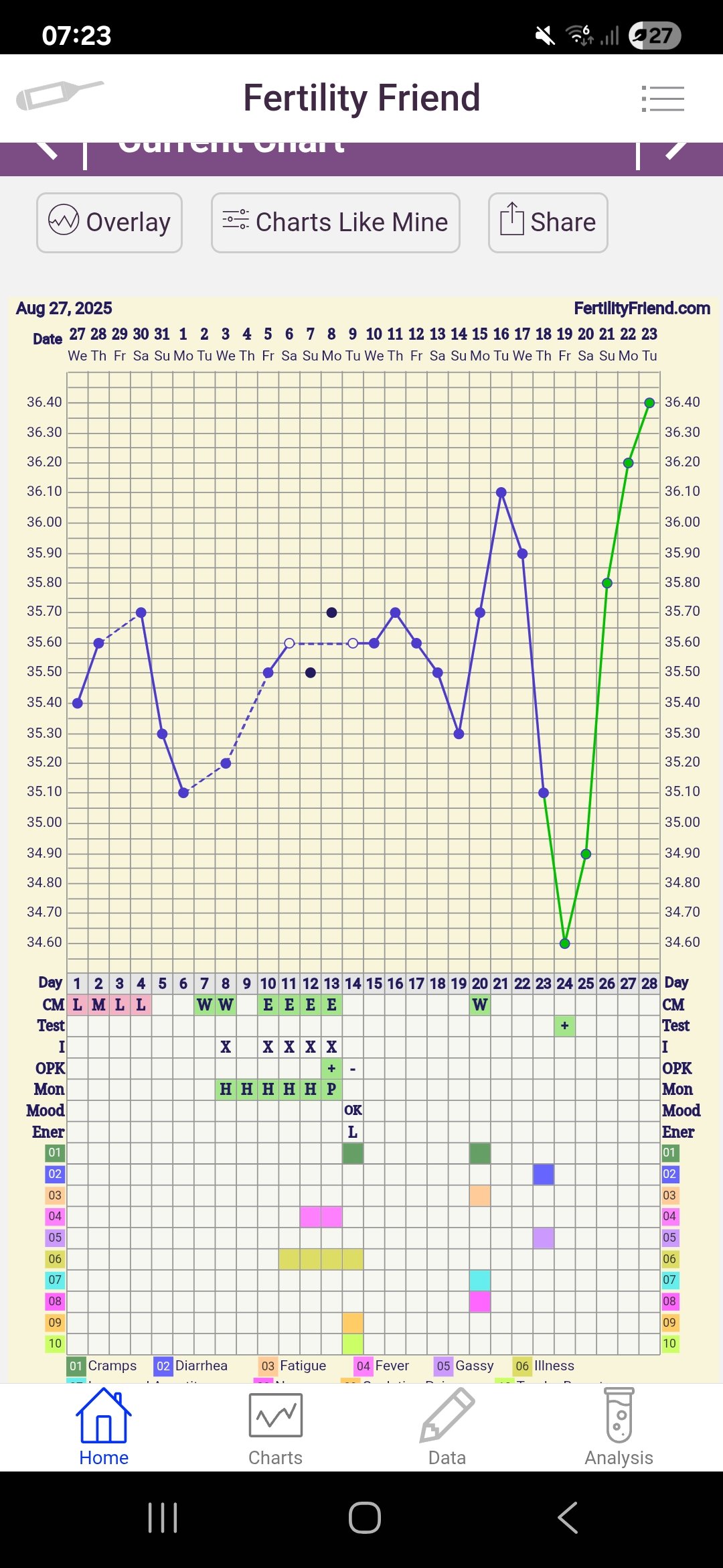 13 dpo: Mer tempstigning og sterkere test enn i går, til tross for en del mer utvannet tiss. Var litt usikker først om jeg burde vente til i morgen. Ååå dette gir meg en god følelse, hvis jeg tørr si det