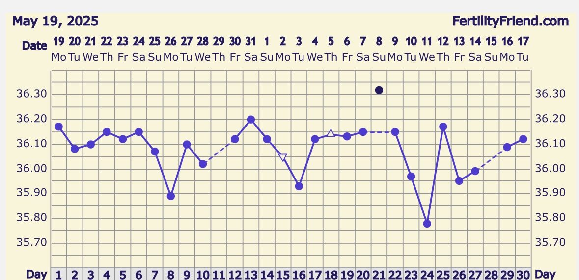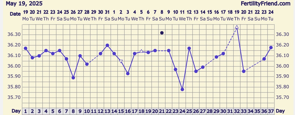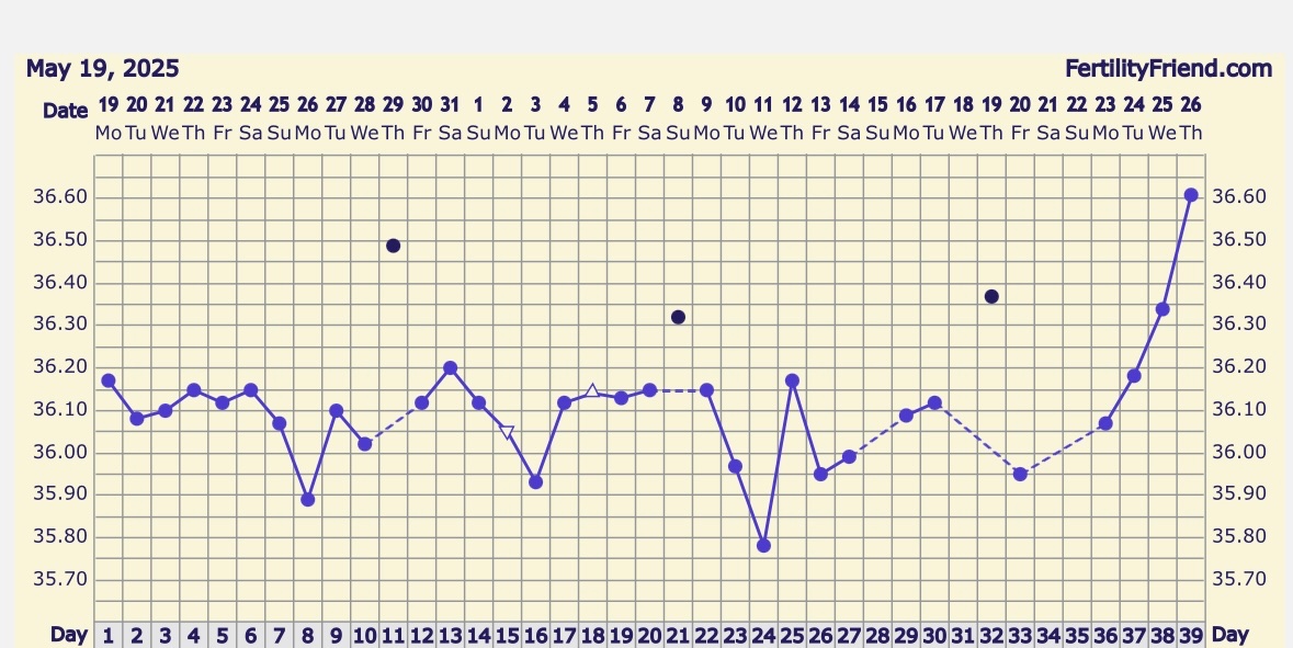 Regner meg som 1 DPO i dag. Tempen steg enda litt i dag og da jeg discarded tempen fra forrige torsdag, ser trenden bedre ut. Forrige torsdag forsov jeg meg skikkelig og da blir min temp veldig høy, så jeg fikk et unaturlig hopp der. Regner med at FF setter et kryss snart. ChatGPT er enig med meg i at jeg hadde el i går.