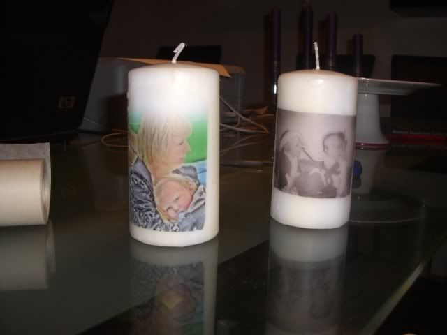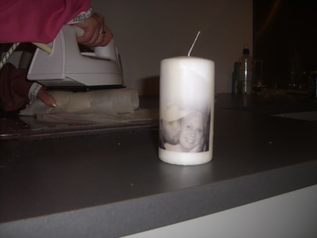 Jeg har laget mange sånne nå før jul. Jeg fikk det ikke til å bli fint med strykejernet, så jeg tok heller å la spiseskjeer på plata på ovnen. Og brukte de til å smelte bildet fast i lyset, funket mye bedre.