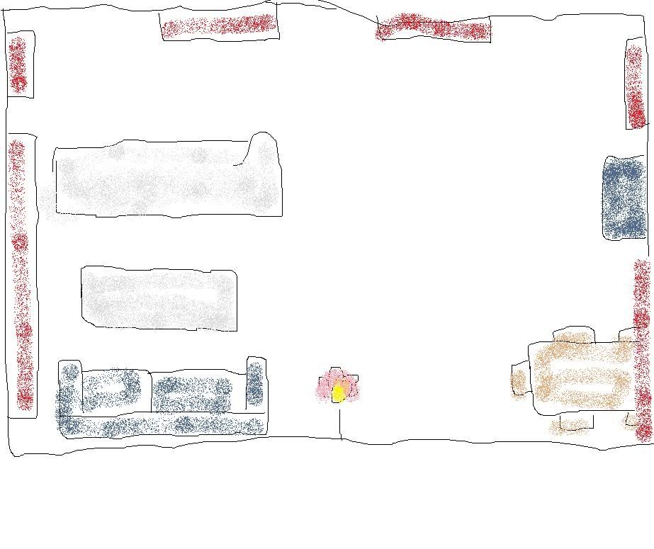 legge ved et bilde.. der det er rødt er det enten vindu (den lengste røde er en vegg med vindu hele veien) dør inn til soverom eller åpen løsning, som inn til kjøkken/gang.. resten er vegg..Ser også sofaen min, stuebordet og den lengste er tvbordet med tv på og slikt..