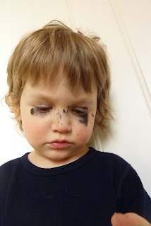 Hørte poden var på badet og påsto at han malte. Fikk jo litt panikk da jeg var redd han hadde funnet hobbymalingen min. Men da jeg åpnet døra og fant dette synet måtte jeg bare le. For gutten gjøre jo ikke noe galt. Gjør jo bare som mamma gjør...