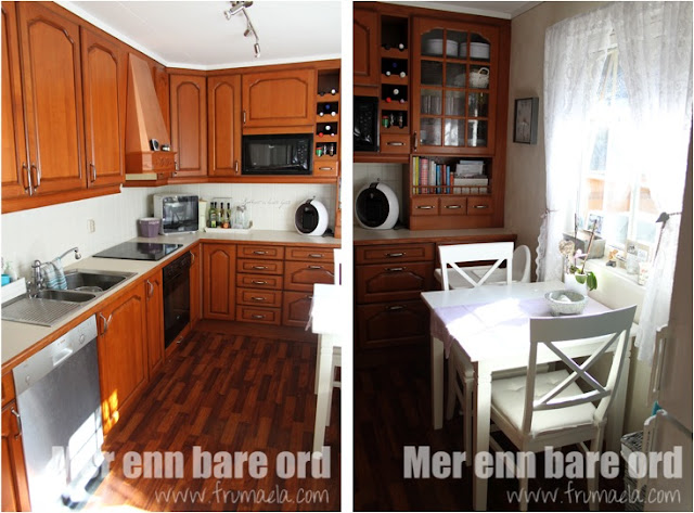Kjøkkenet skal bli hvitt i løpet av året, men skal ha nye gardiner nå i sommer.