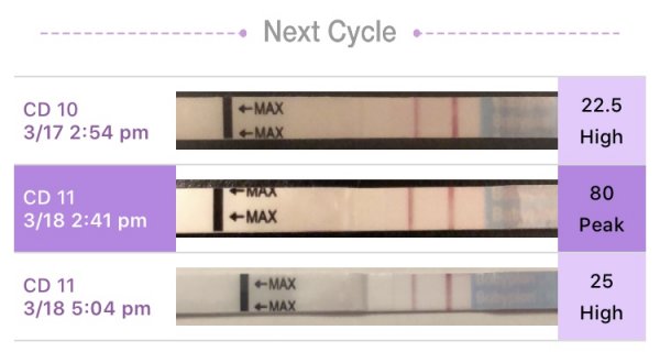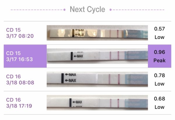 Håper på supersterk i kveld eller i morgen tidlig.《Kan da umulig ha hatt så kort LH-topp?! Forrige syklus hadde jeg knall-positive tester tre dager på rad. Forstår ingenting!》