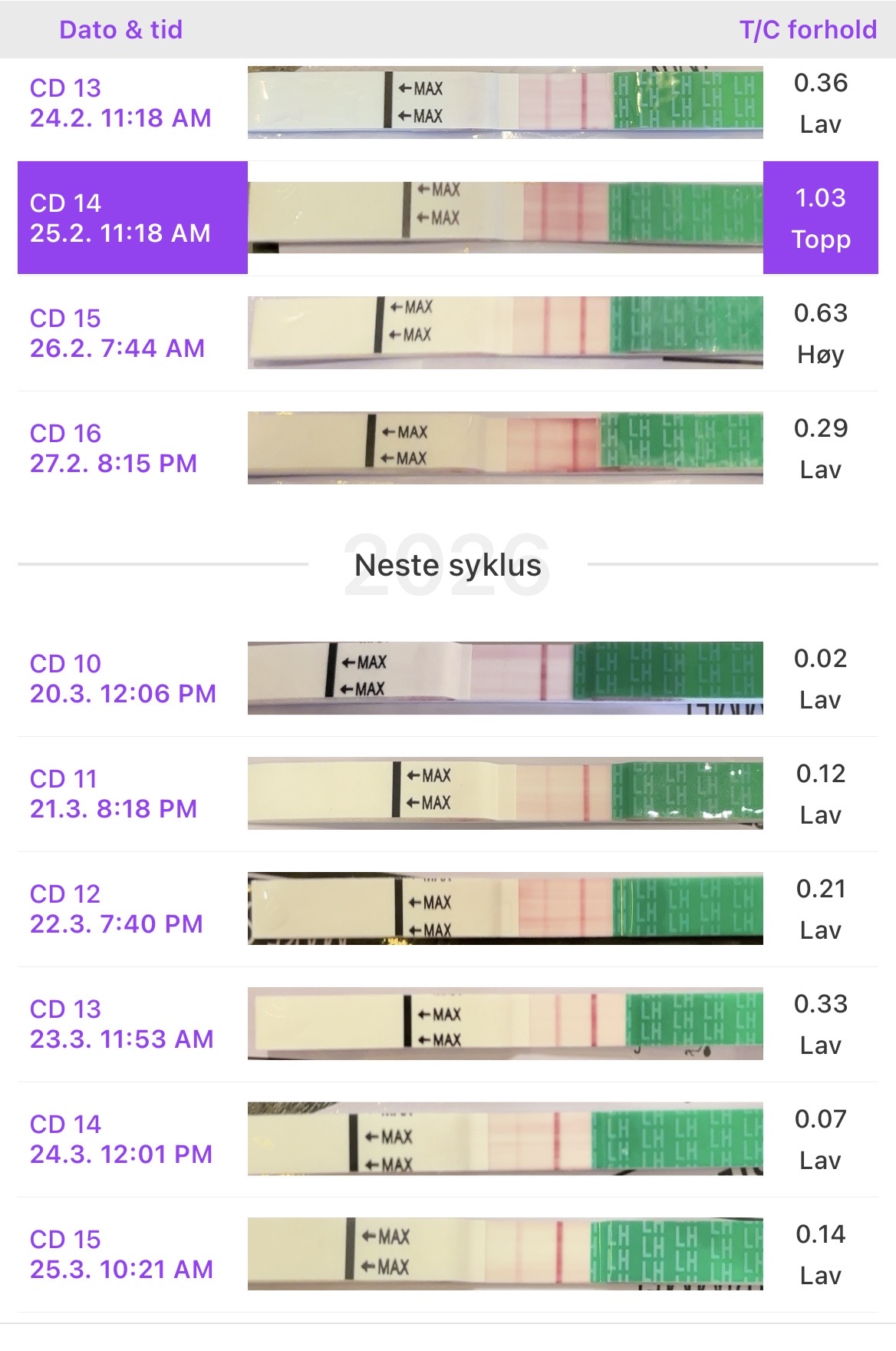 Trur kanskje det er fordi jeg tester i for utvanna u? Vet jo at det har mye å si for utslaget. Så siden jeg er såpass usikker valgte jeg å skrive 26.03. Den siste der ble tatt på nesten helt blank u. Andre syklus etter fødsel i november