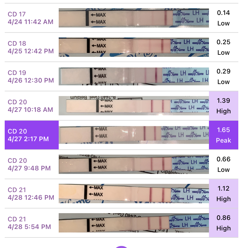 Jeg skjønner meg ikke helt på mine egne tester heller. Hatt ganske sterke, neeeesten helt positive i går og i dag. I følge Premom skulle el vært i dag, men tror ikke det ut i fra testene. Har hatt el-slim. Kan for så vidt være peaken er i dag, men høyeste tallet på testene på Premom er 0.85. Forrige syklus var peaken på 1.62.