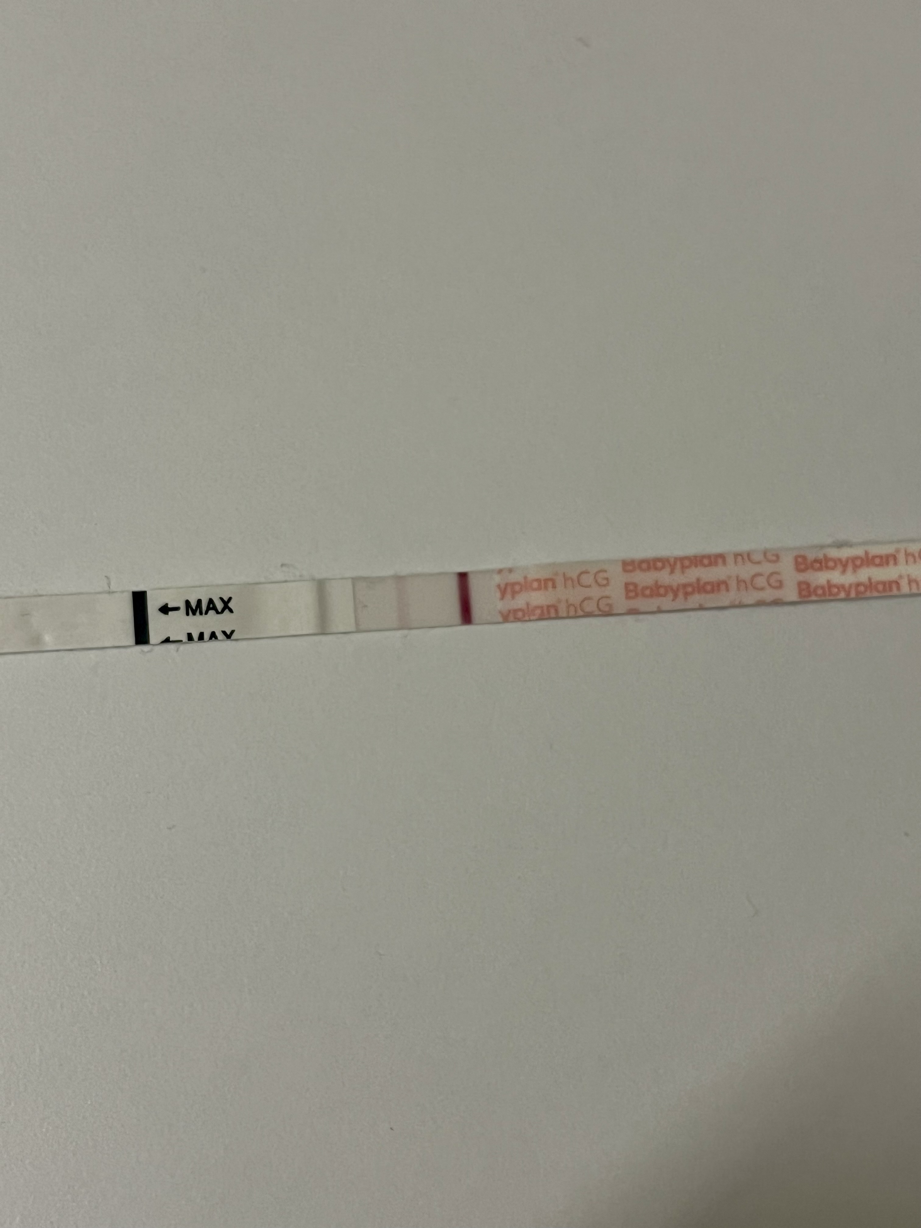Jeg er så spent på dine vegne. Hvordan går det med deg?Ja. Jeg tok 2 vanlige 25 mIU/ml-tester etter to glass vann og en kopp kaffe Streken kom etter ca. to minutter – svakt rosa, obviously – og jeg er usikker på om jeg klarer å fange den skikkelig på kamera. Her er et bilde med filter på, bare for å gjøre streken mer synlig.