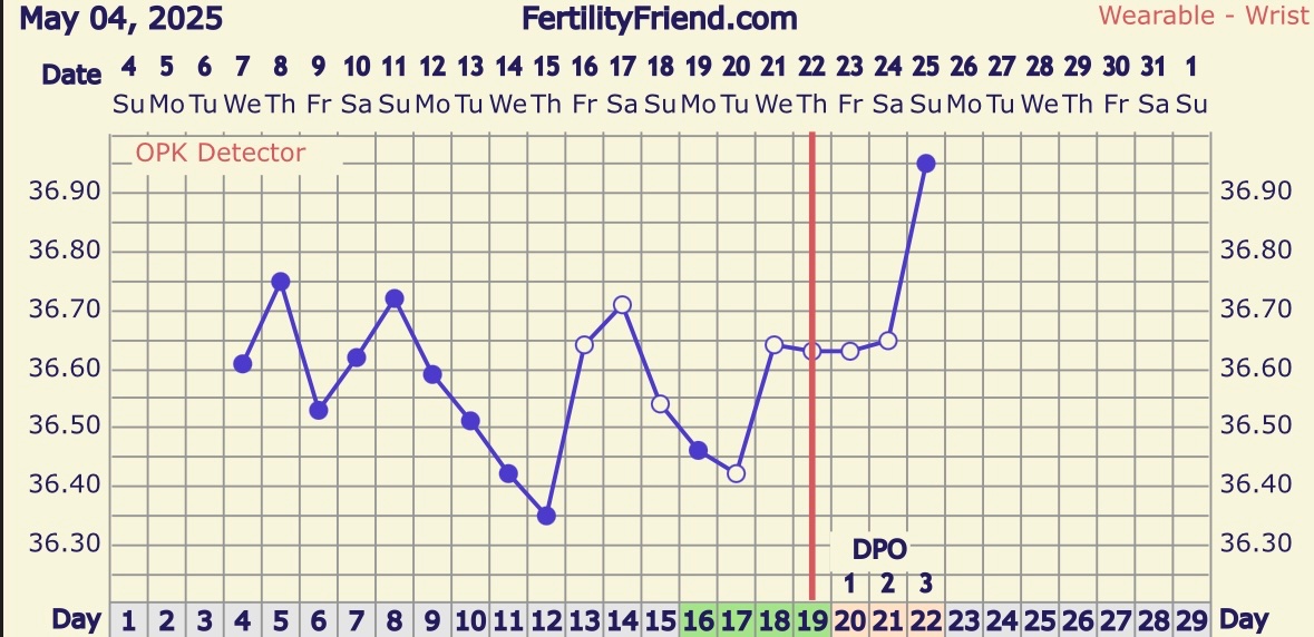 Har heldigvis symptomer som alltid kommer i DPO land, ømme bryster og oppblåst