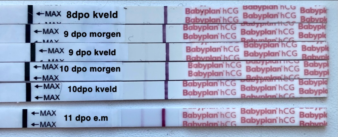 Her vil jeg bruke meg selv som eksempel. Forrige svangerskap fikk jeg den svakeste streken på 11dpo, den ble ikke med på bilder en gang så svak var den. Denne gangen var den samme streken der på 7 dpo!