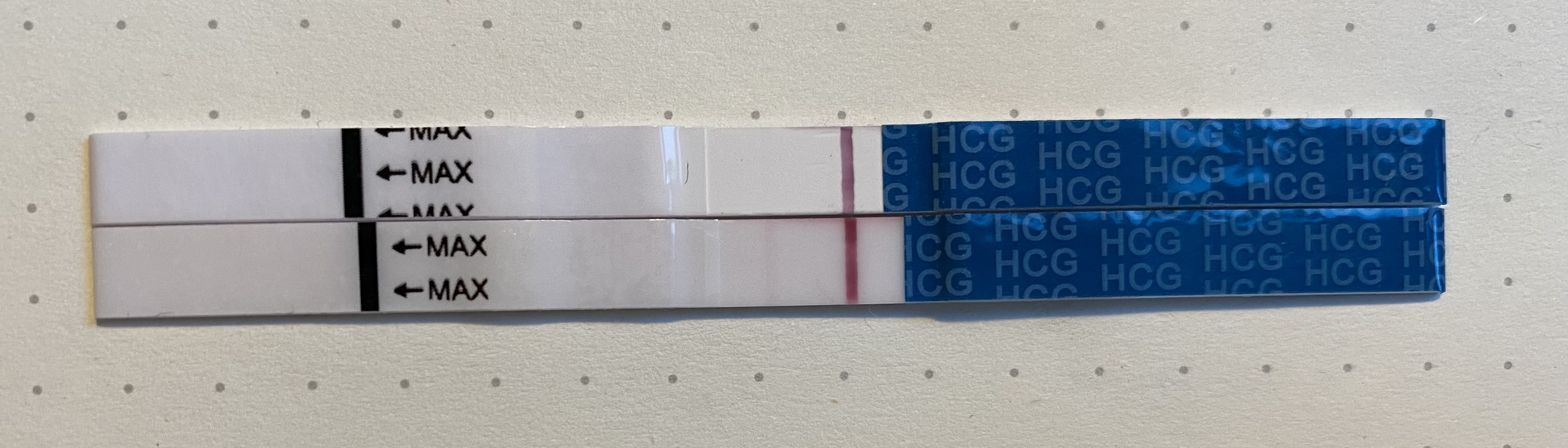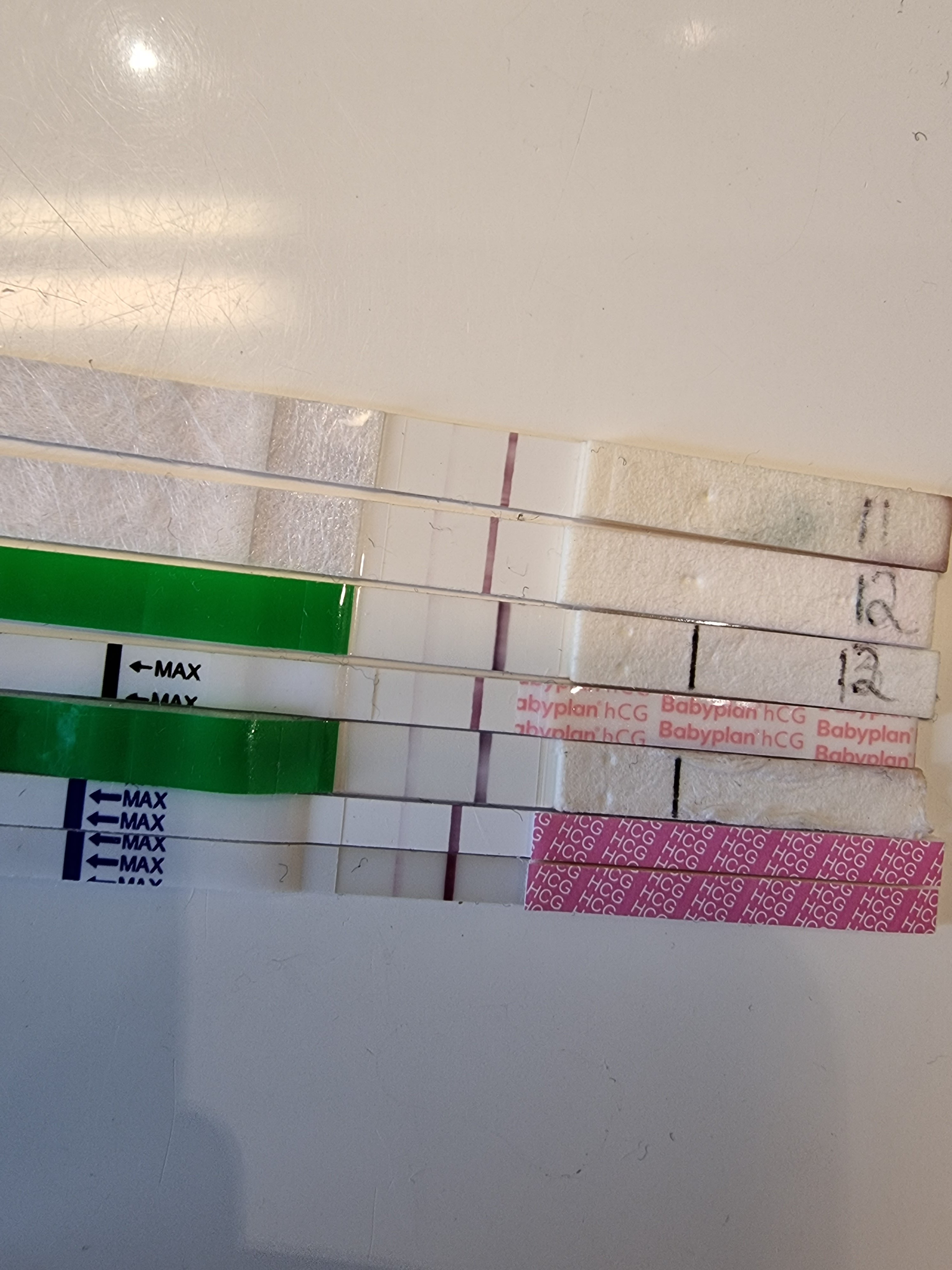 Dagens test nederst, annet merke så vanskelig å se stigning. Jeg synes jo den er sterk til at jeg nå er på dag 3 med blødning.. men svak til å være 14DpoEnda ikke fått svar på hcg prøven...