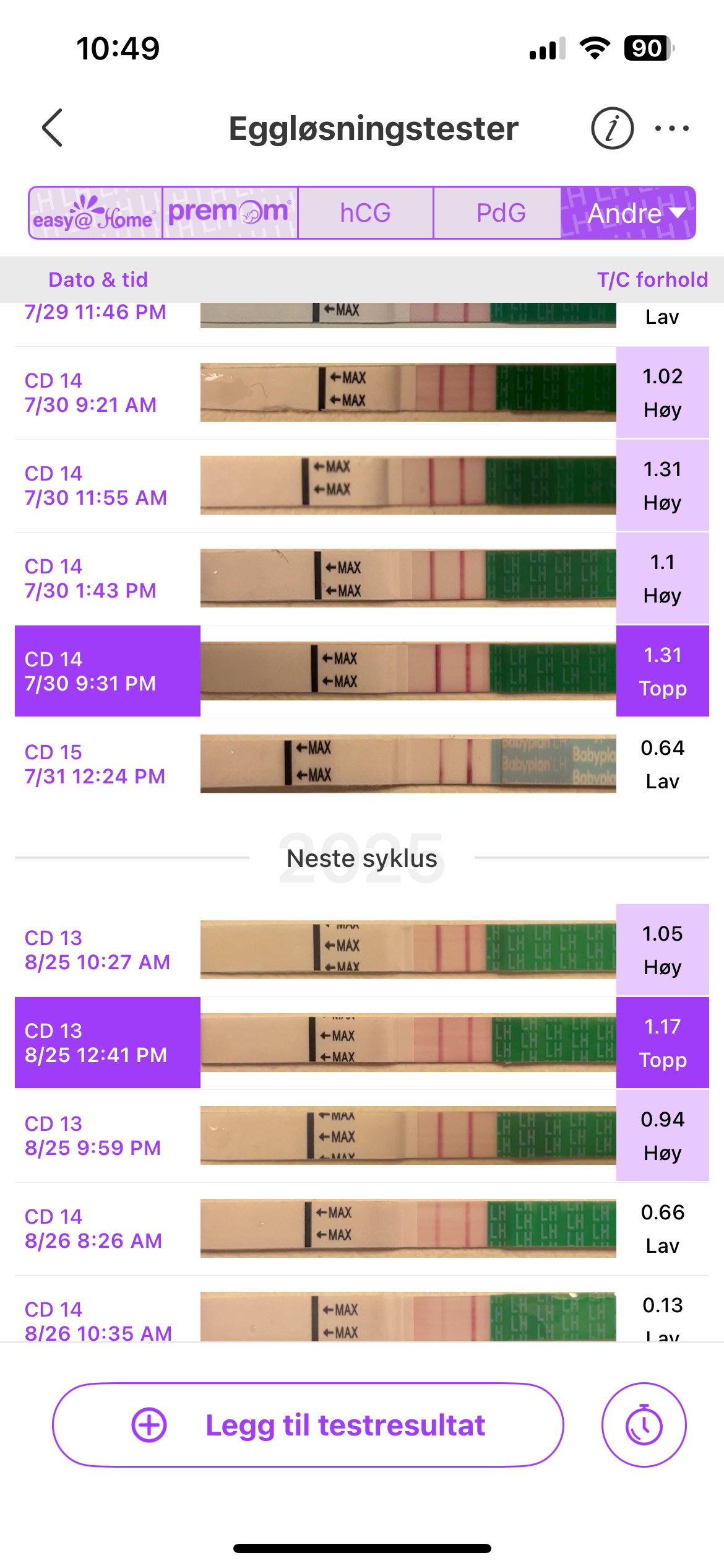 Uansett, peak i dag. Litt TMI, men jeg har aldri, og da mener jeg aldri, hatt så mye EL-slim som jeg har nå. Krysser alle fingre og tær for at det er en sjuk bra ting.Takk for tips! Da kjører jeg litt hyppigere testing fremoverMine tester er også litt rare på letrozol, men det jeg har merket er at peaken er veldig kort og alltid på kvelden. Så fra cd 12 til positiv test tester jeg minst 2 helst 3 ganger om dagen for å ikke gå glipp av peak