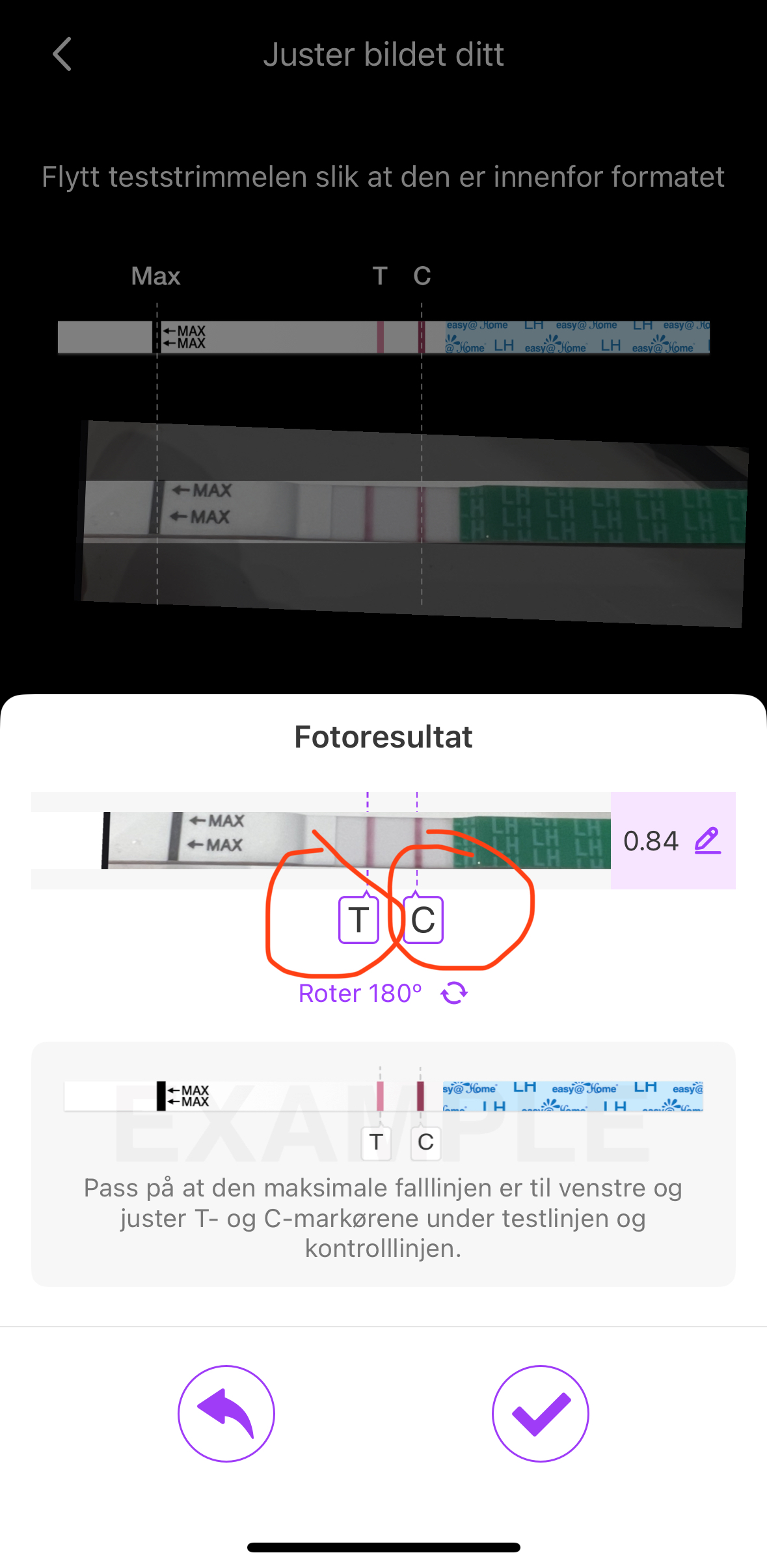 Tusen takk for at du svarte!Jeg tror ikke du har hatt EL enda, men det virker som fargen ikke har trekt ordebtlig opp enda på bildene. Jeg lar testene ligge 15-20 minutter da blir de tydeligere. Og så tror jeg du må passe på at premom har satt T og C på riktig sted, da denne ser ikke ut som en 0.63: