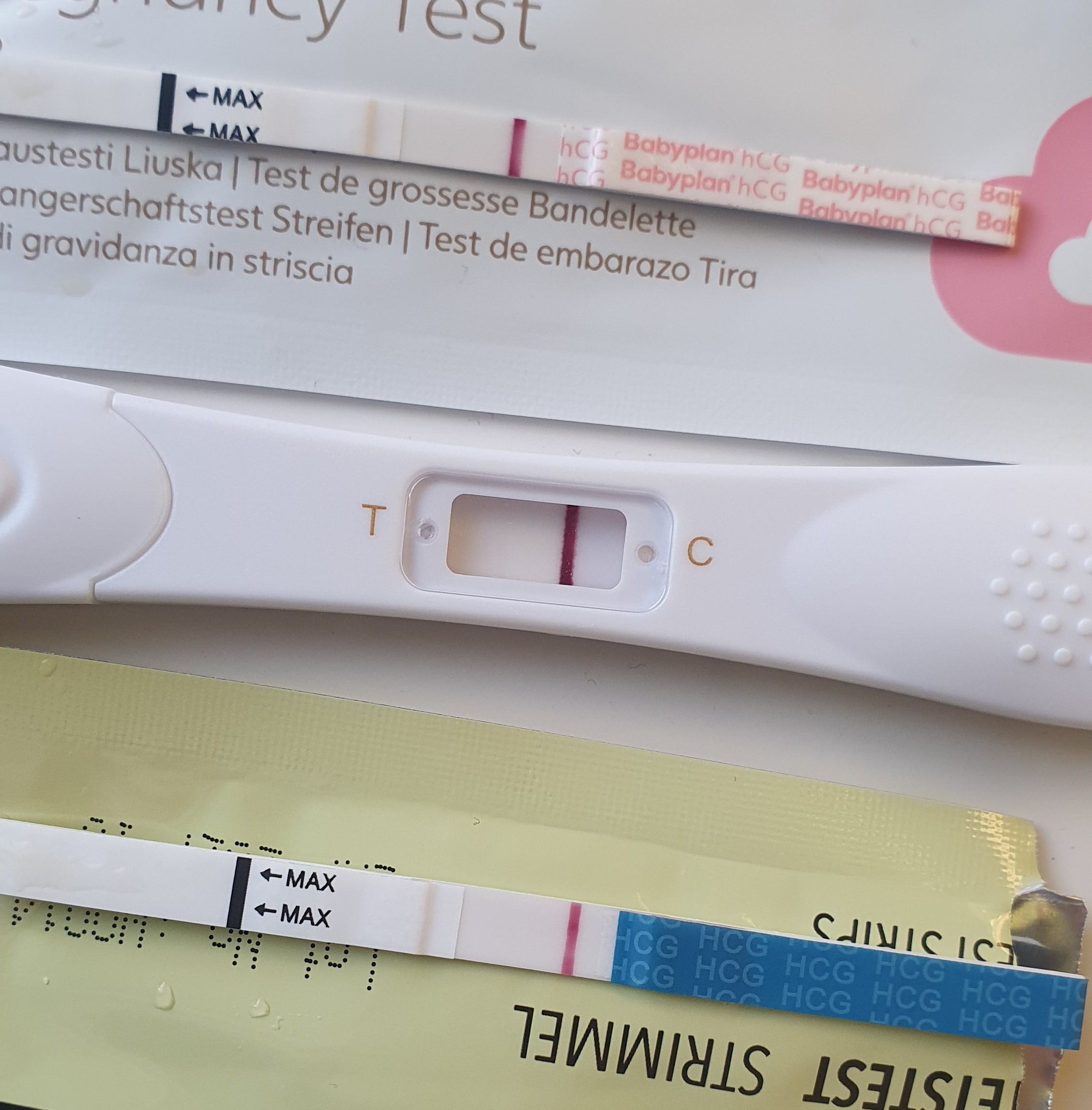 Så i dag tidlig tok jeg en babyplan vanlig test. Syntes at jeg kanskje kunne skimte en skyggestrek. Tok derfor å fyrte av en babyplan tidlig stav. Og der kom det en tydelig rosa strek! Svak, men jo tydelig at det var en rosa strek likevel. Tok en makesure i tillegg som var litt som den vanlige babyplan, bare litt svakere kanskje. Vet ikke om jeg klarer å se strekene på vanlig test på bilde, de er veldig svake. Litt sånn at man må myse i riktig lys. Men tidligtesten i midten her tror jeg kommer bedre frem på bildet. Ser streken bedre i virkeligheten da.