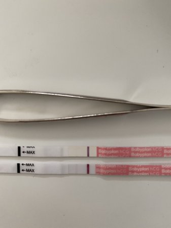 10 dpo i dag og ser strek på Babyplan tidlig! (Den nederste). Den øverste er fra i går, 9 dpo. Håper dette går veien!!!