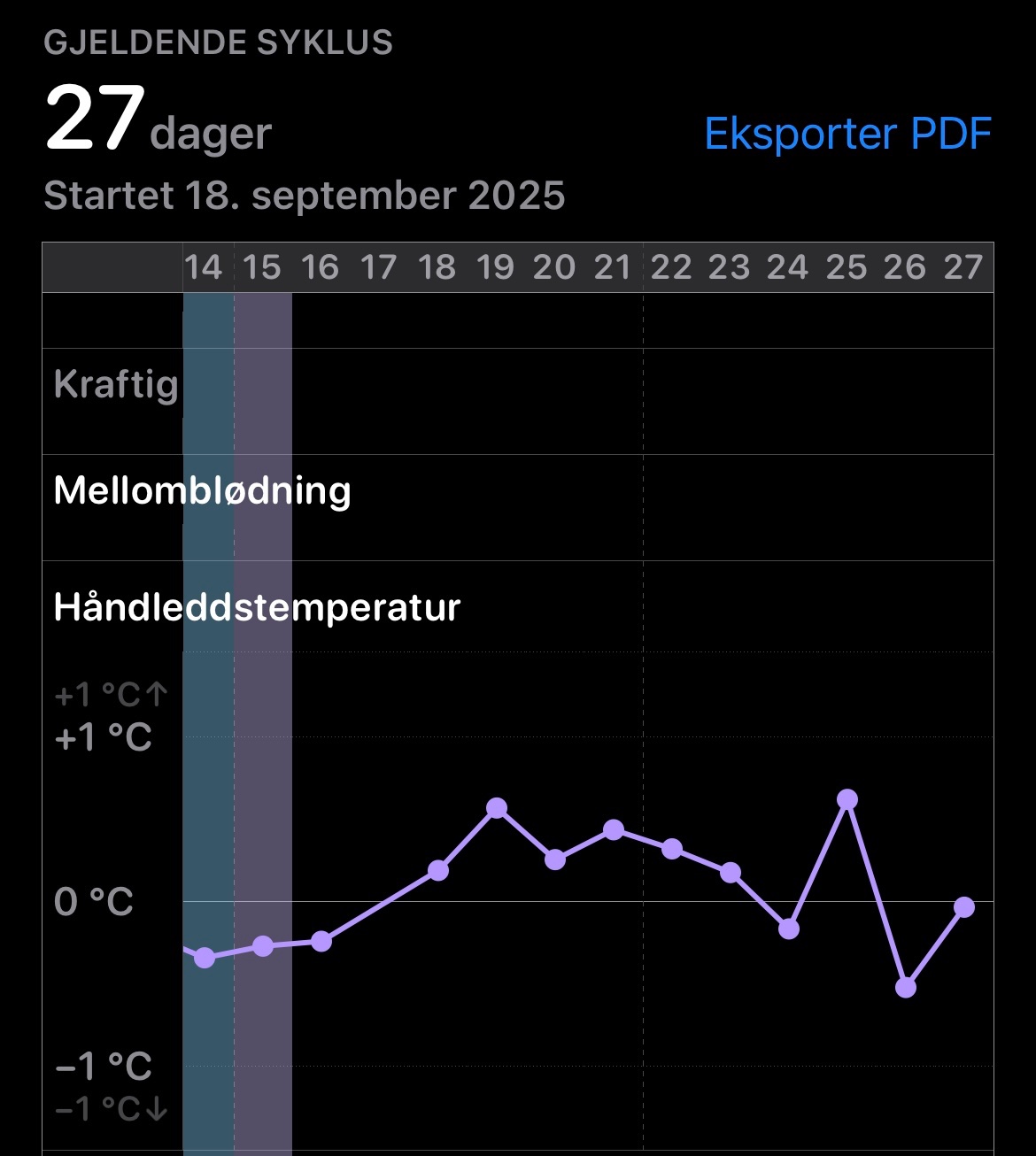 Vil bare sende deg en klem! Det er så frustrerende når kroppen ikke «gjør som den pleier», og spiller oss et puss. Kjenner følelsen, og den er ikke god. Man mister liksom litt kontroll, på en måte.Negative tester de siste dagene - og i dag. 13-14 dpo, tror jeg. Er på dag 27 i syklusen i dag, og skjønner ingenting. De siste årene har syklusen min gått fra å være 28 dager helt konsekvent til å være 26-27 dager. Jeg får spotting hver.eneste.måned 1-2 dager før mens, jeg får migrene hver.eneste.måned 1-2 dager før mens, jeg blir kjempeøm i magen hver.eneste.måned 1-2 dager før mens. Men ikke denne måneden. Ingenting. Ingen tendenser til noe som helst.
