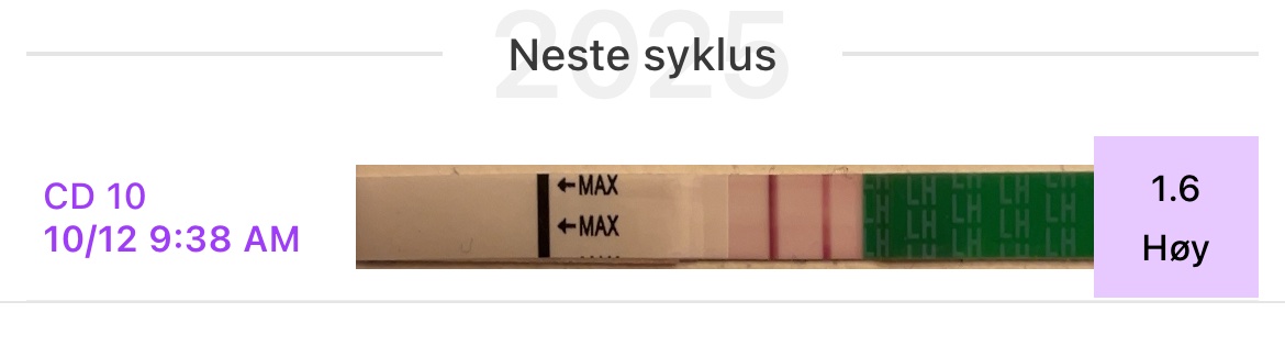Sånn så det ut i går, tar snart en ny for å se om det har fortsatt å synke eller peaker på nytt (har de siste pp fått en dipp før ny peak)Har du tatt flere tester i dag? Ble nysgjerrigja viktig å henge med når kroppen bestemmer seg for at tiden er inne
