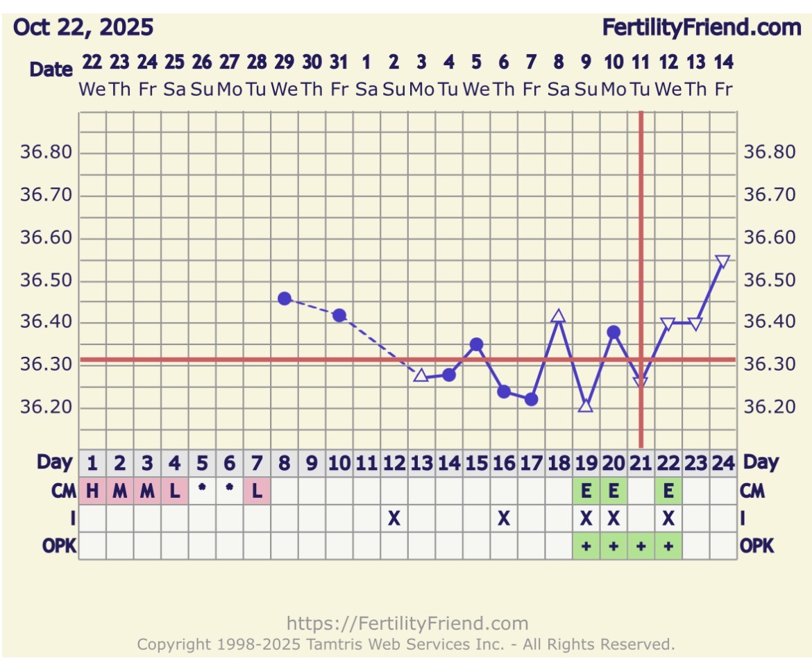 Æææ tempen min begynte å stige i dag som om EL skal komme i morgen, men EL målingene mine har bare så vidt begynt å øke. Lurer på om jeg vil få en veldig rask topp i dag eller om den kommer veldig sent? Veldig klar for å komme meg over i DPO land iallfall!