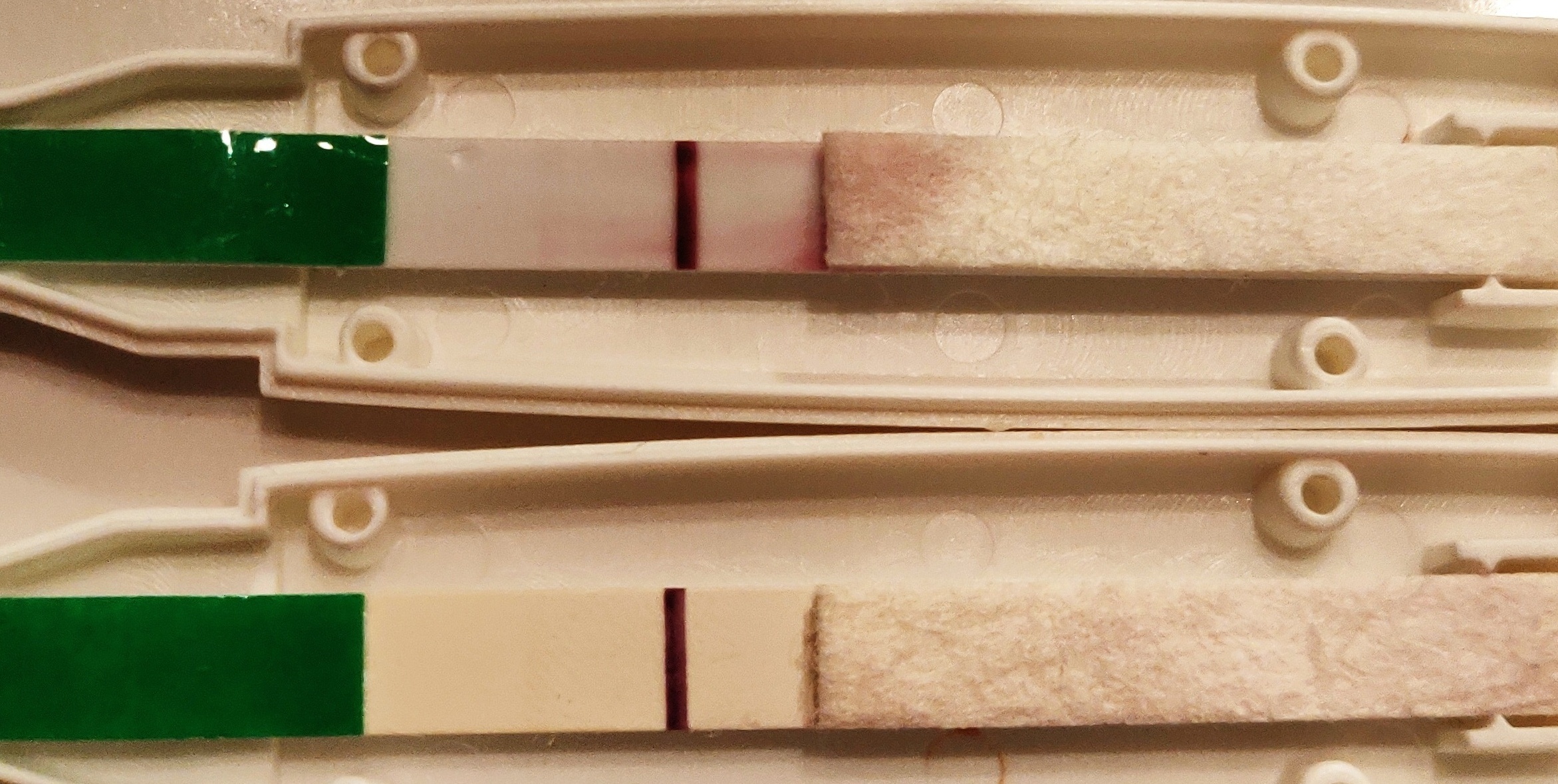 Tok ny test idag da jeg fremdeles er kvalm og har ømme pupper. Øverste idag, nederste er fra fredag og har tørket og vises nesten ikke lengre.