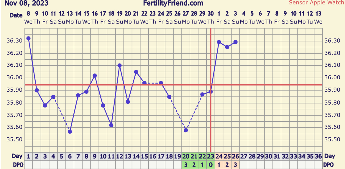 3 dpo og tempen holder seg foreløpig ganske jevn. Håper sånn at den fortsetter å holde seg høy og jevn. Det ville nemlig vært et godt tegn, de to forrige pp var den ganske hakkete. Når det klaffet med yngste barn var den jevn som dette hele veien til positiv test 9 dpo. :nailbiting: :love017