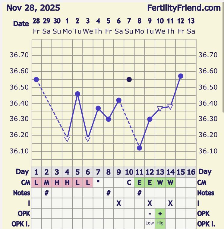 Eg er veldig spent på når eggløsninga faktisk har vore. Temperaturhopp i dag. Personlig tippar eg CD 13. Uansett blir det ein kort syklus denne gongen, sidan eg har lutealfase på maks 12 dagar, oftast 11. Får vel svaret mitt om eit par dagar når eg har fleire temperaturar!