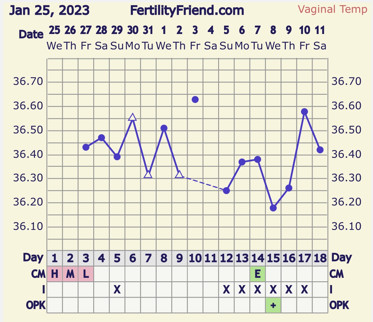Har tempet siden cd1. Det er første gang jeg tester det, men er ganske sikker på at el ikke har vært. Har ikke fått kryss heller. Har blitt gravid på cd21 (fullgått svangerskap) og cd25 tidligere (ma), så har jo i utgangspunktet lange og ustabile sykluser. Noe som bare er enda mer irriterende i disse prøvetider, haha!