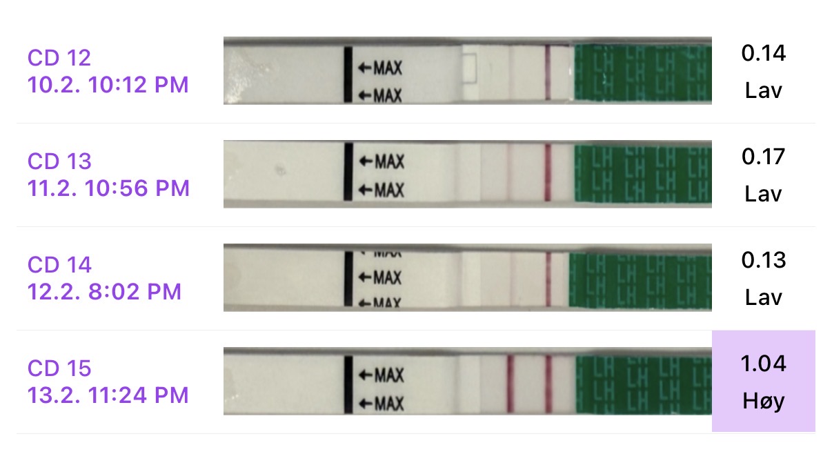 Jeg skal egentlig ha eggløsning på CD17, som er på tirsdag. Og etter å ha blitt litt oppslukt de forrige PP har jeg slappet litt mer av, tenkte bare jeg skulle ta en baseline-test i går morges. Så var den øøørlitegrann høyere enn jeg likte. Tok en ny i går ettermiddag, som var "høy" (1.0), og en ny i natt på 0.84. I morges var den 0.47 igjen. Så jeg antar faktisk at jeg har eggløsning i dag - og dermed at IKM også kan finne på å komme i uke 9. Jeg bruker ikke ha veldig høy topp, kanskje 1.2 max.