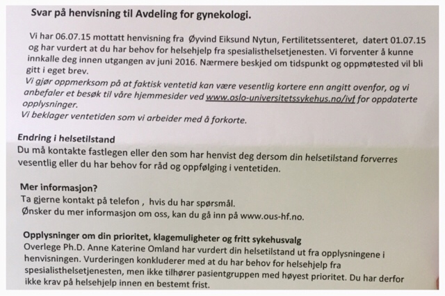 Jeg kunne ikke starte rett på samme mens (juni), og i juli har de sommerstengt. Så har jeg ferie i august, så vi må vente til sept, 4 mnd, fra første til andre forsøk, og det er frys.