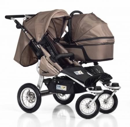 Tvillingvogn fra TFK med mulighet for å ta av den ene sittedelen for å sette på en hardbag. Med oppløftbare fotbrett og fjæring på bakhjul. Finnes i sort og brunt