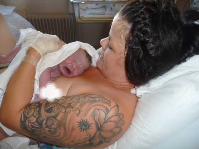 Kikket ned, og der låg en perfekt liten baby med MYE mørkt hår!! Jm løftet henne opp, og jepp! Var en jente gitt..