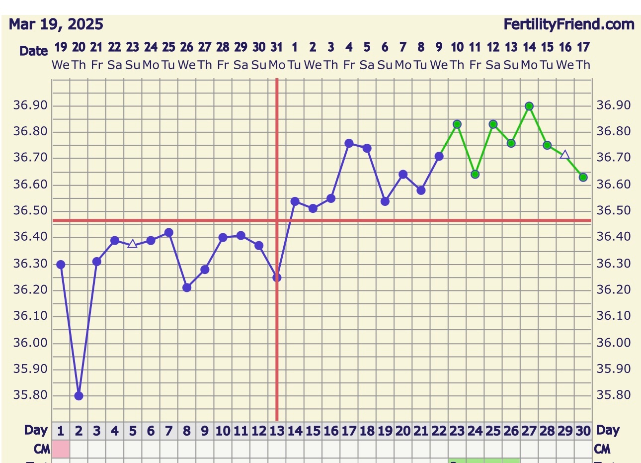 Tusen takk for at du deler. Er så utrolig lei mg. Alt hadde gått så fint til nå. Hadde EXU i februar. Min nedgang kom de tre siste dagene og har bare gått nedover…..Om det kan være til trøst, så ble dette vår datter: Da jeg så denne grafen ga jeg opp å tempe og tenkte at dette gikk ikke, men det gjorde det.