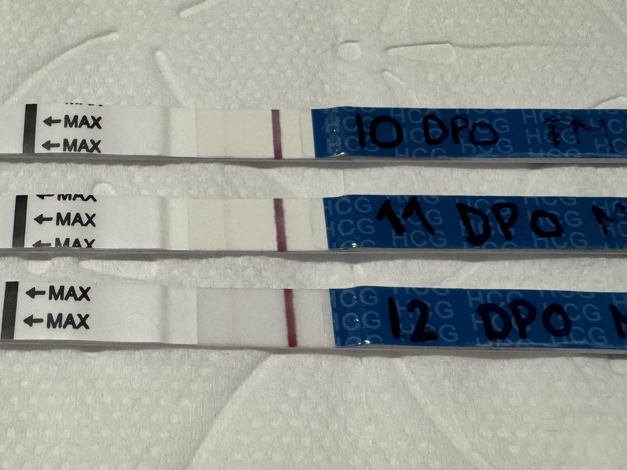 Mine tester var svakere på morgenen! Jeg mistet troen litt hver gang. Så jeg sluttet å teste morgen, fikk alltid sterkere på ettermiddag / kveldTesten i dag morges er nesten lik den fra i går, eller lysere. Føler det lover litt dårlig, men jeg var oppe på do i halv fem-tiden så morgenurinen i dag var ikke like konsentrert fra i går (prøver jeg å si til meg selv). Får bare se… er i alle fall fremdeles antydning til strek, men tenker at den burde bli sterkere nå når det er 12 DPO, ikke svakere.
