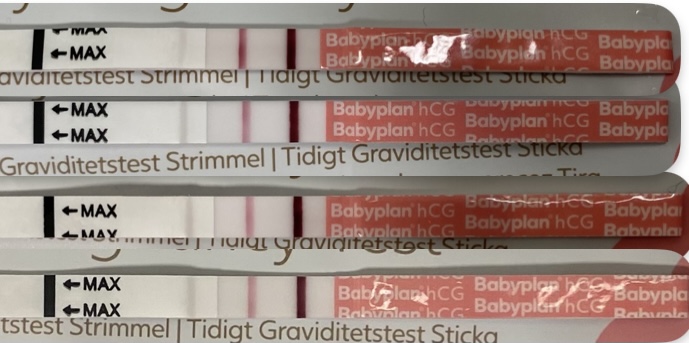 Jeg hadde tenkt å avskrive hele forsøket, frustrert over å ikke kunne skille mellom symptomer fra medisiner eller en eventuell graviditet. Men i går begynte symptomene å bli merkbart sterkere, ømme pupper, stikking i livmor, rar smak i munnen, trøtt, økende sult… Og ja, har blitt noen tester i skjul, alle tatt ca 60 timer etter injeksjon med 1/2 dose Ovitrelle. Den øverste er fra i dag :Heartred Nå blir plutselig blodprøvene på tirsdag og torsdag til uka spennende likevel :bag: