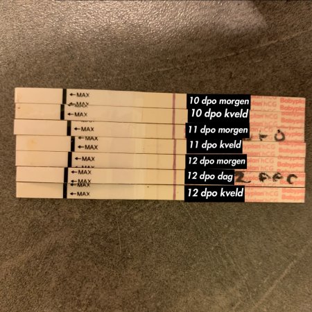 Synes det ser greit ut. Man ser jo at de blir tydeligere. Men det er ikke så lurt å bruke strimler for å sjekke øking dersom man lett blir bekymret, pga at de kan variere i mengde fargestoff samt at konsentrasjonen i urinen varierer selv om man tar testene til samme tid hver dag. HCG dobbler seg hver andre dag så i morgen er de nok enda tydeligere, men er du veldig bekymret ta dette opp med legen din å få tatt en HCG måling i blodet med et par dagers mellomrom så kan de bettygge deg. Er ikke bra å gå å bekymre segHva tror dere om denne stigningen? Er 12 dpo i dag og allerede tatt 3 digitale tester de siste dagene hvor alle sier «ikke gravid». Synes også stigningen er alt for dårlig og hadde forventet sterkere strek og positiv digital i dag... Er så redd for at dette er kjemisk