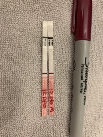 Den ene testen viste svak positiv og den andre jeg tok i dag er jeg faktisk litt usikker på. Strimmelen ble misfarget der det skulle være hvitt, men kan egentlig ikke se noe annen strek enn kontrollstreken..?!
